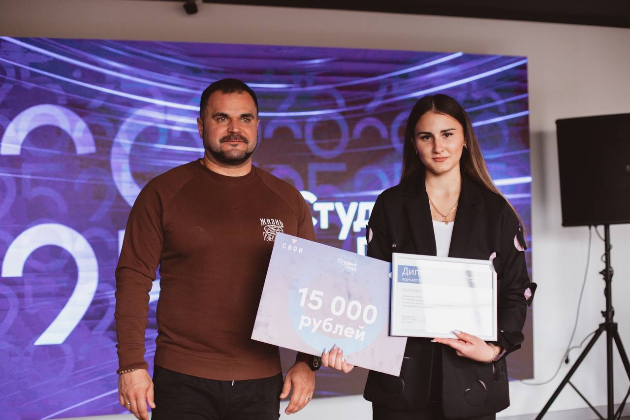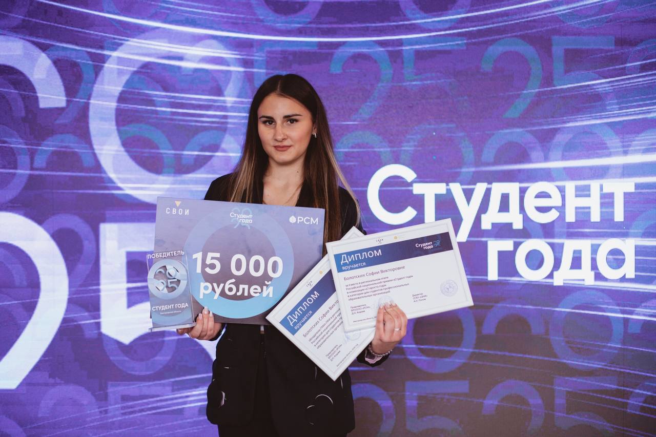 Студентка 3 курса факультета СПО София Болотских заняла 1 место в региональном этапе премии «Студент года – 2025» в номинации «Староста года» и стала обладательницей ГРАН-ПРИ национальной премии!