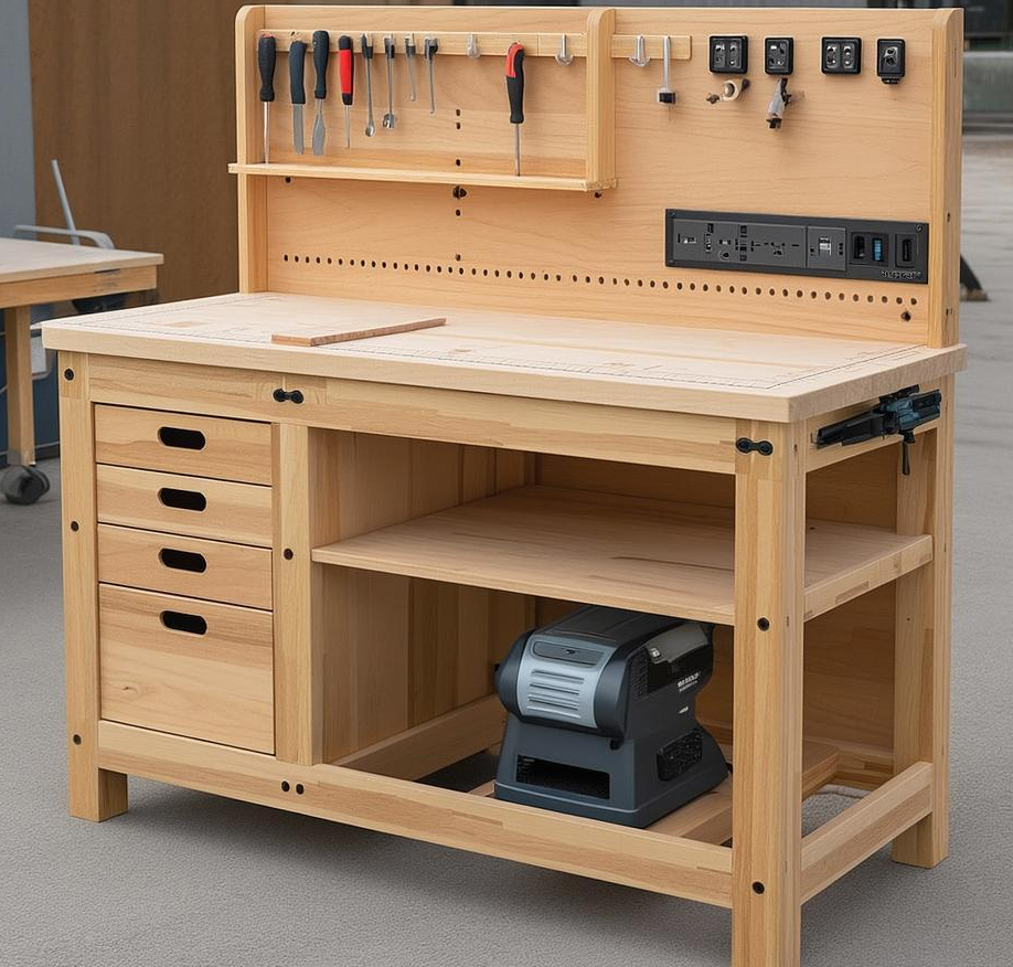 - Электрификация: Подключение сетевого фильтра с несколькими розетками делает рабочее пространство более современным. Он может быть встроен на боковой панели верстака, а возможность удобно разместить зарядные устройства для аккумуляторных инструментов исключает проблемы с разряженными батареями.
