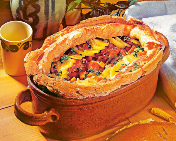 После этого картофель нарезается кружочками толщиной 4-5 мм и укладывается слоями в жаровню вместе с мясом и овощами. Важно заполнить все пространство, заливая продукт винным маринадом. Тесто замешивается из муки с добавлением соли и холодной воды. Из полученной массы формируется жгут, который укладывается по краю жаровни, обеспечивая герметичность. Затем жаровня накрывается крышкой.
