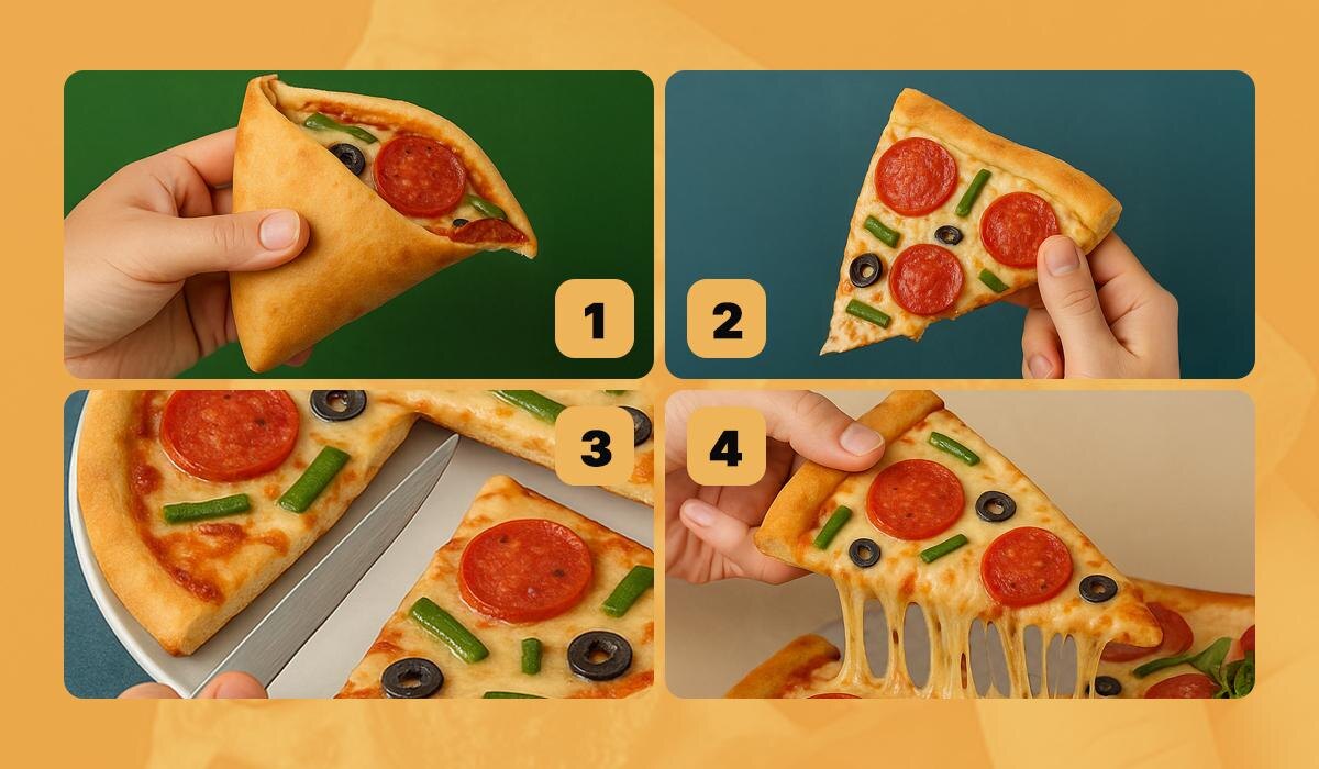- Вариант 1: Складывая кусочек пиццы пополам, вы демонстрируете свою склонность к быстрой смене настроений. Вам нравится контролировать окружающую обстановку, однако в отношениях с близкими вы иногда проявляете непостоянство.