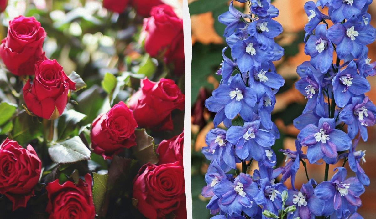 - Дельфиниум. Это величественное растение с высокими побегами и яркими цветами идеально дополняет розы, создавая впечатляющий объем и разнообразие.
