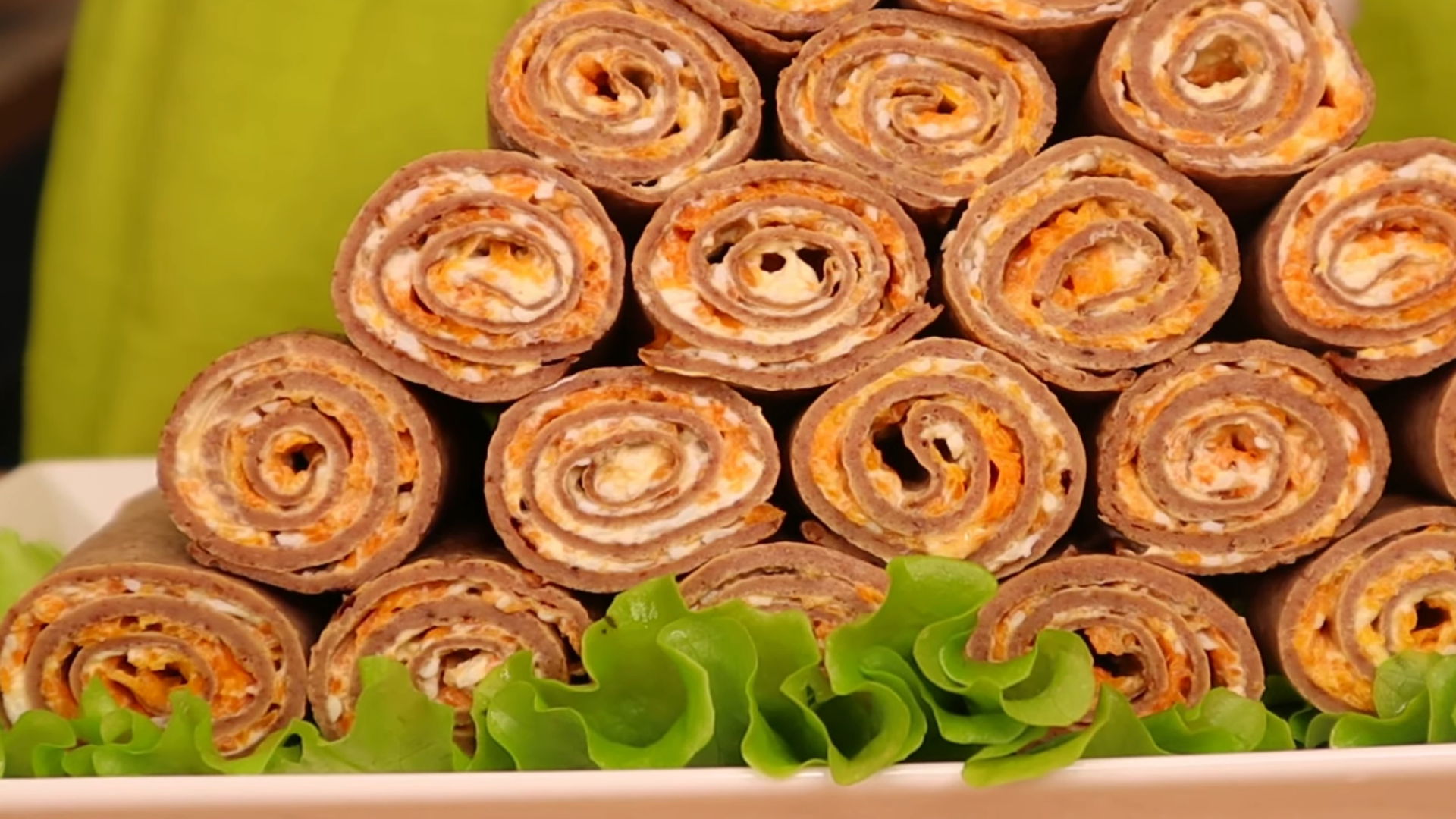 Смажьте каждый блин получившейся яичной смесью и заверните в рулеты. Чтобы роллы получились полноценными, внутрь можно положить морковь по-корейски. Бруски из печени необходимо обернуть пленкой и убрать в холодильник. В конце останется только нарезать их и красиво подать, передает Telegram-канал «Рецепты на праздник».