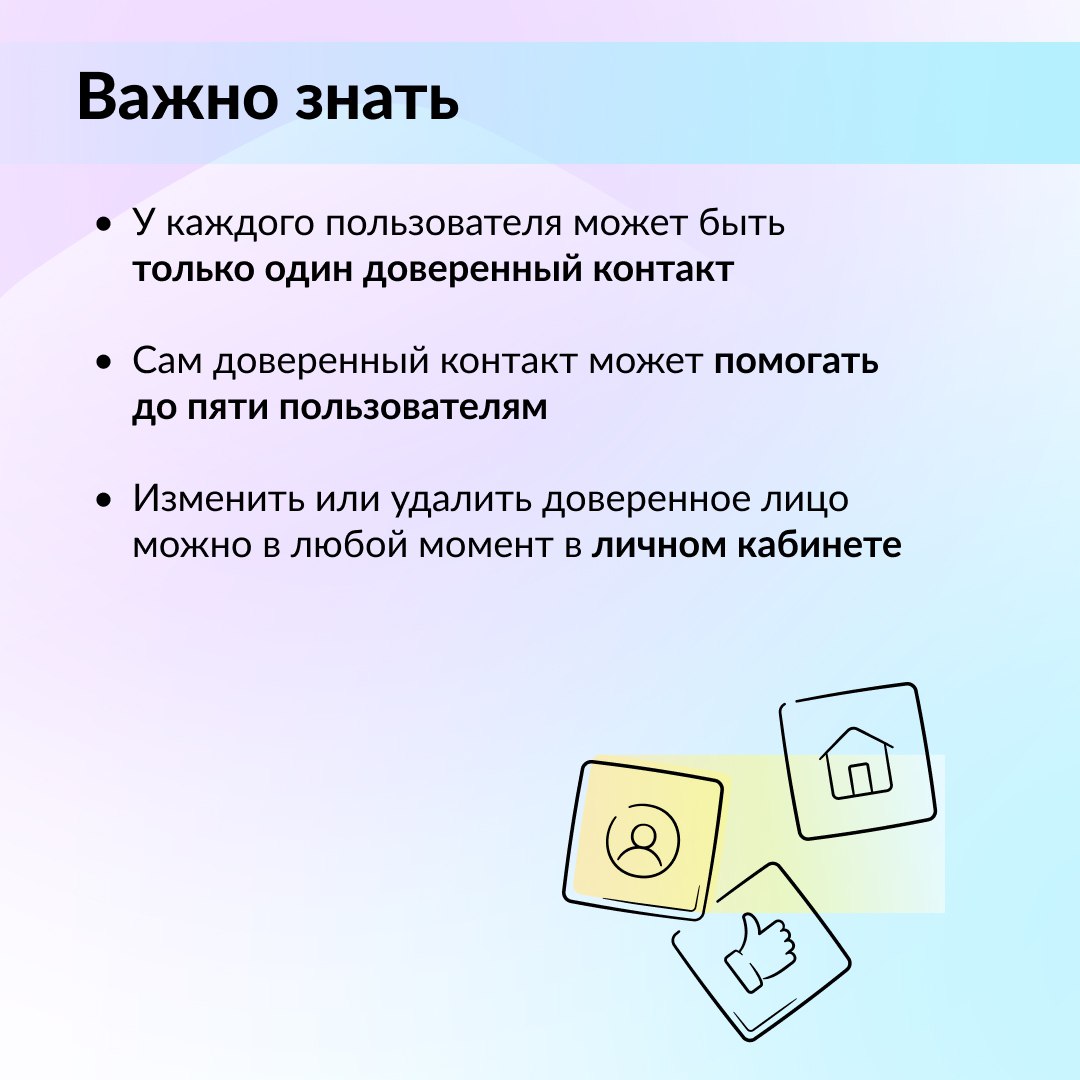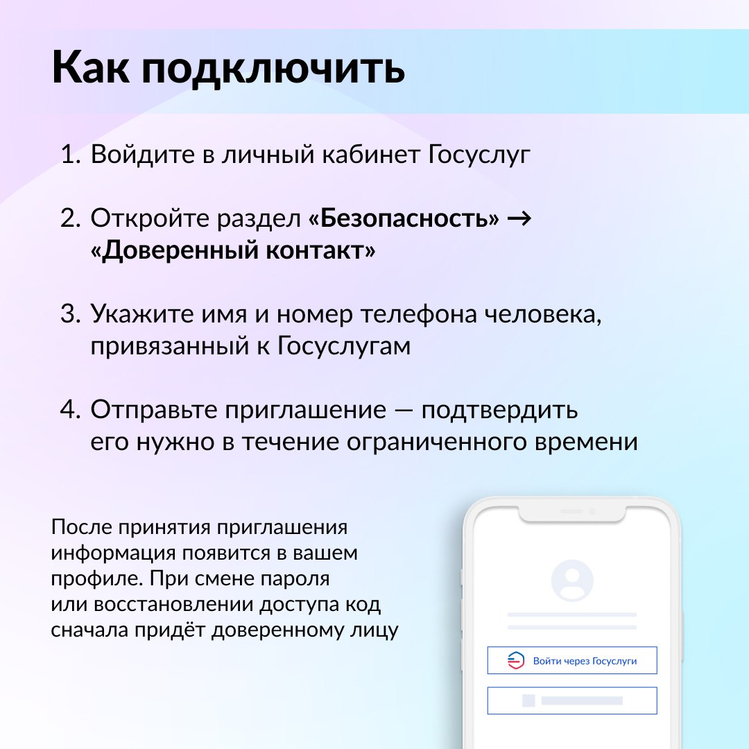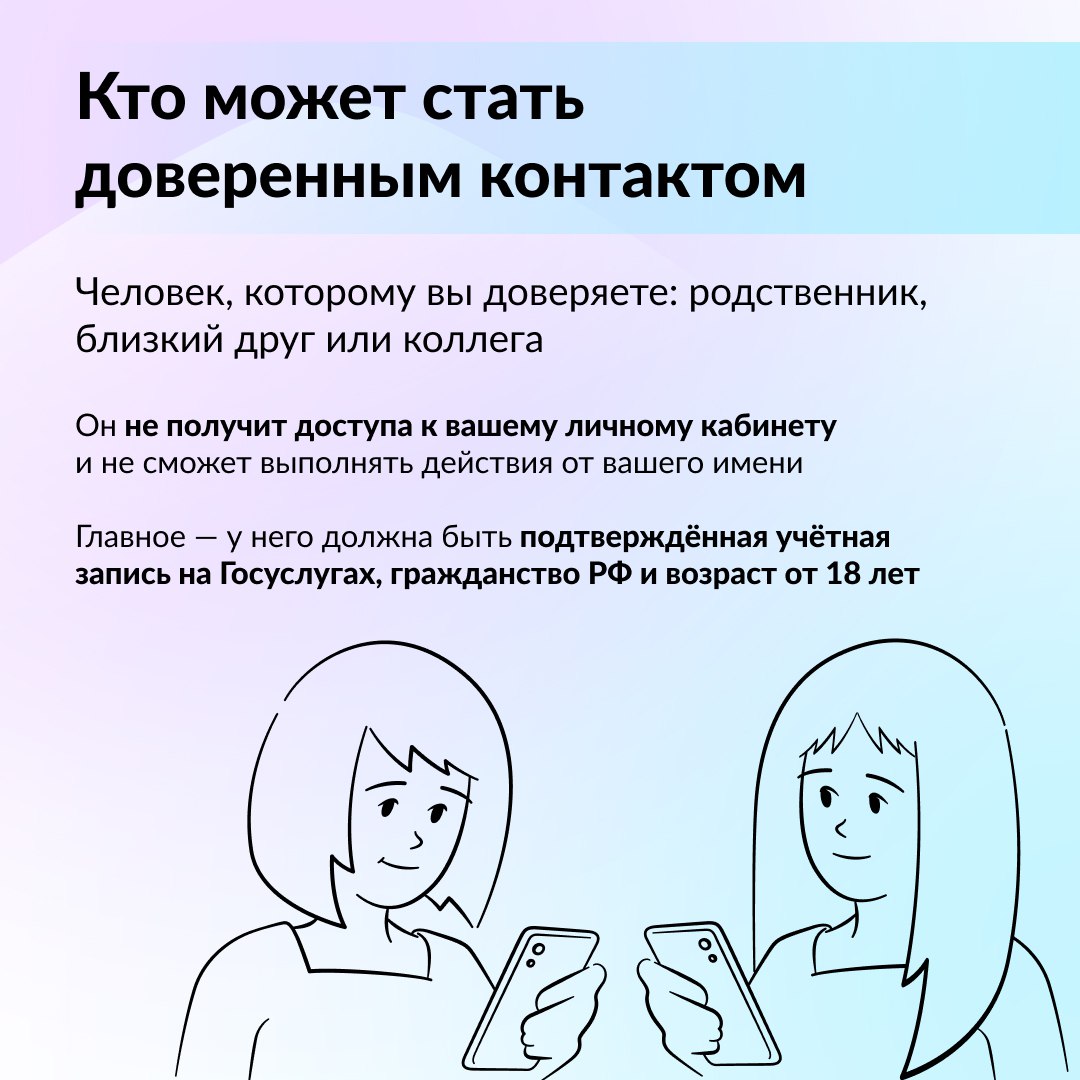 Она помогает обезопасить доступ к личной информации и не дать мошенникам изменить ваш пароль. Подключить доверенного человека можно прямо на портале Госуслуг: gosuslugi.ru/landing/trusted_contact.