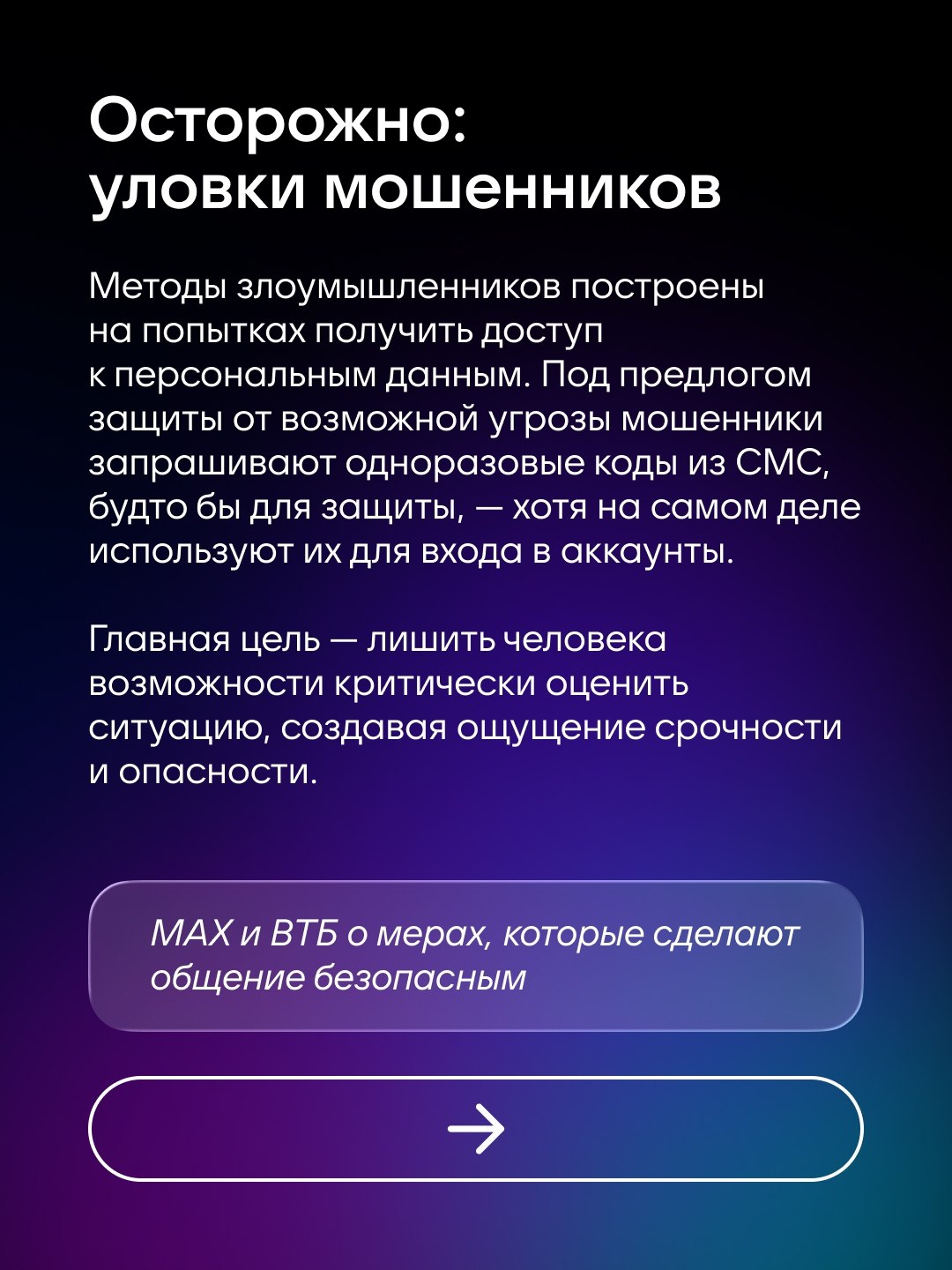 Необходимо помнить, что сотрудники MAX и ВТБ никогда не звонят пользователям с просьбой сообщить СМС-код. Любые подобные звонки — мошенничество и их необходимо игнорировать.