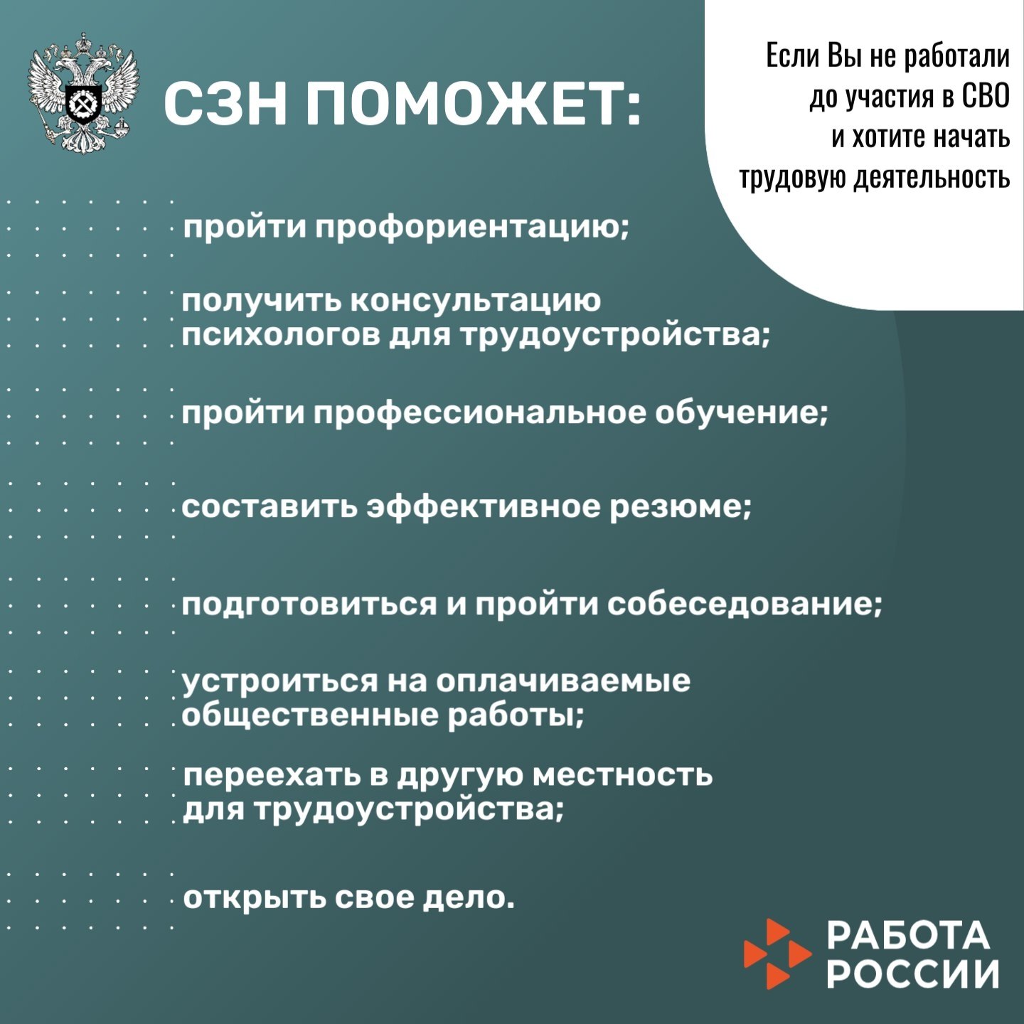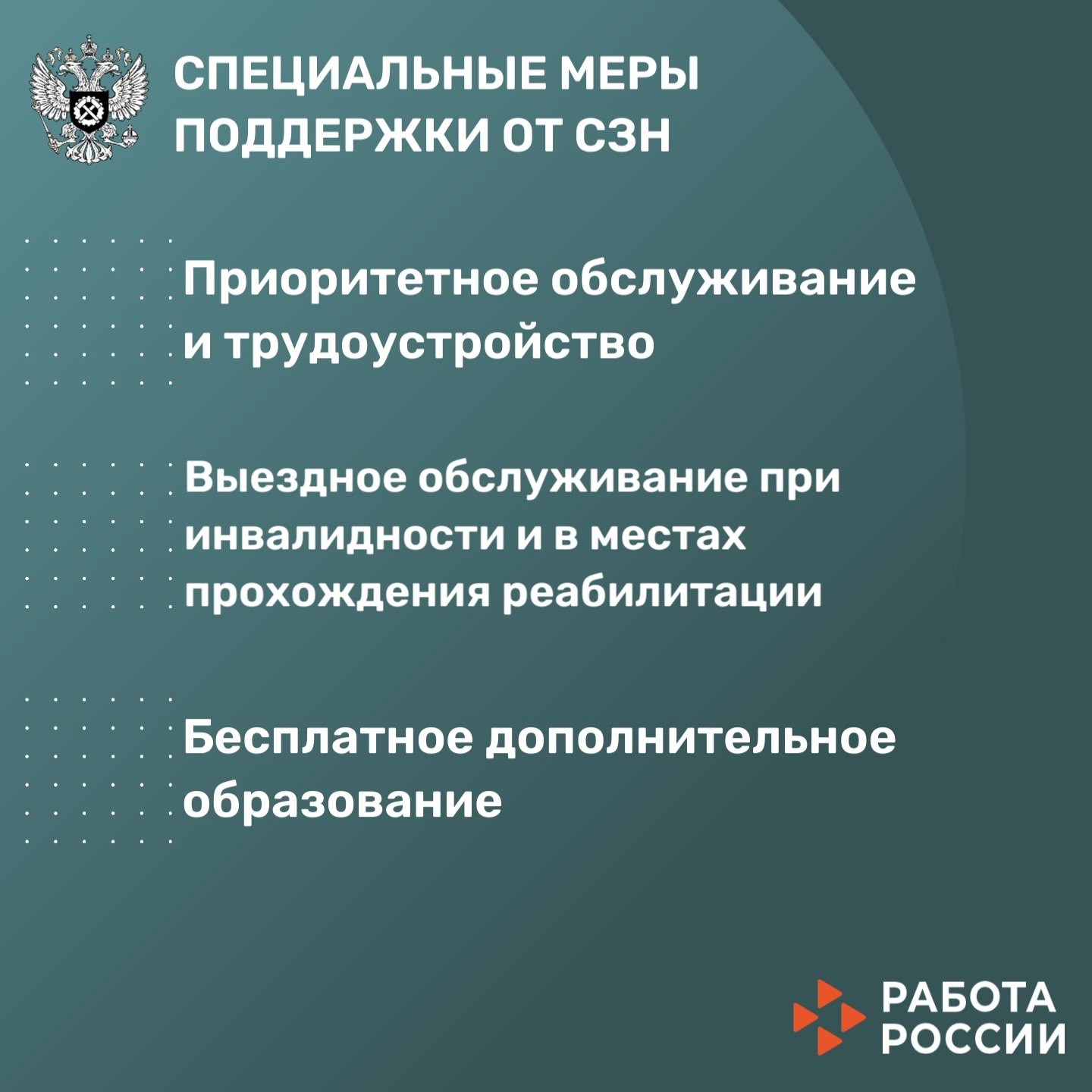 Там собрана информация о мерах поддержки, которыми могут воспользоваться участники специальной военной операции через портал «Работа России» trudvsem.ru/ и получить в центрах занятости населения.