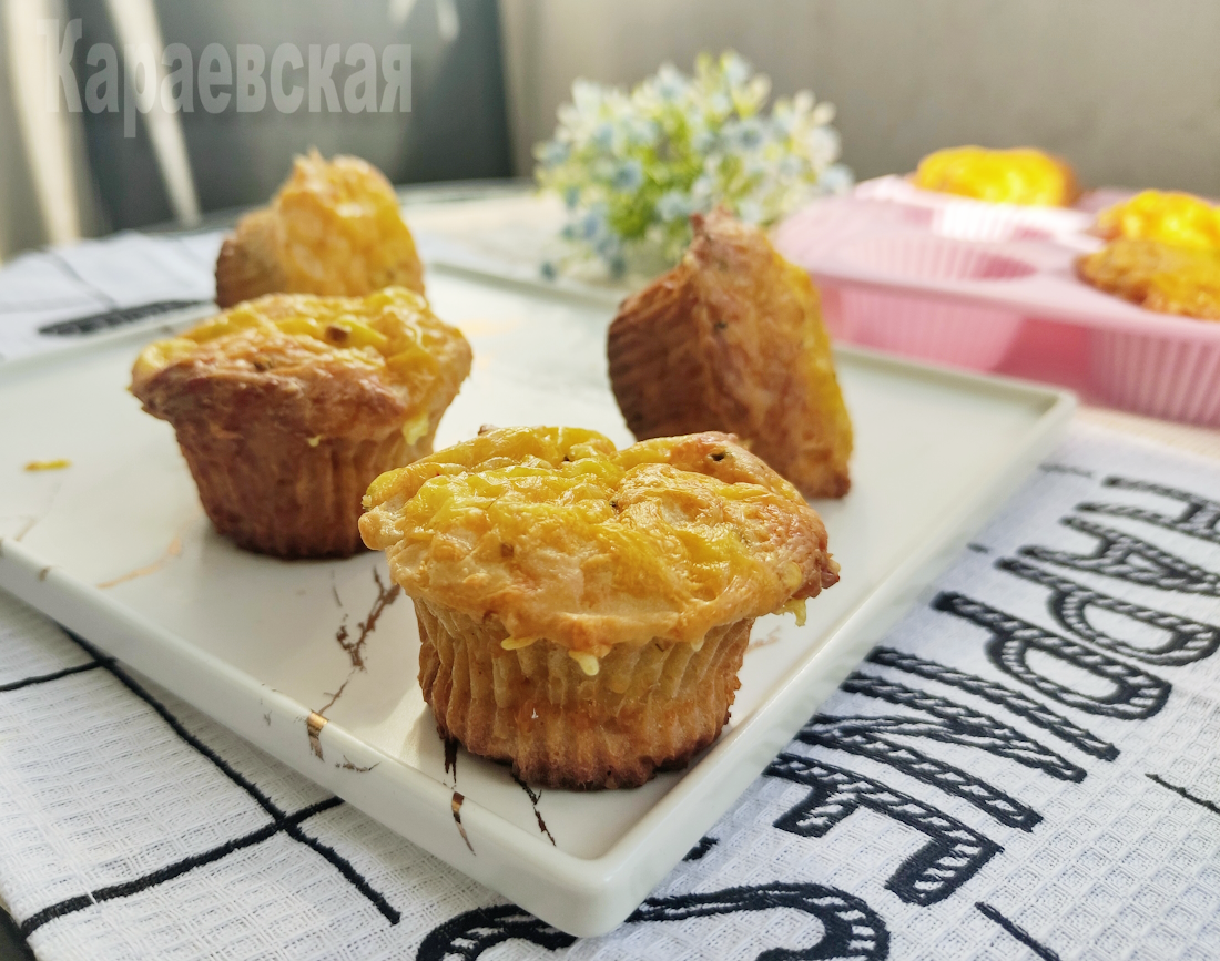После этого следует объединить творожную массу с сухими компонентами и тщательно перемешать. Затем тесто равномерно распределяют по формочкам для кексов, добавляя сверху немного тертого полутвердого сыра для золотистой корочки. Выпекать маффины следует при температуре 180 градусов, пока они не станут румяными и аппетитными.