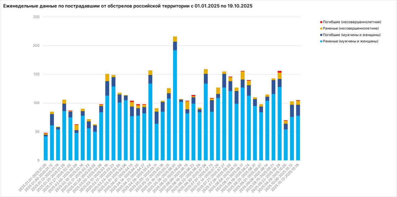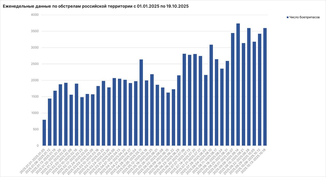 За семь дней ВФУ выпустили не менее 3 595 боеприпасов по гражданским целям на российских территориях.