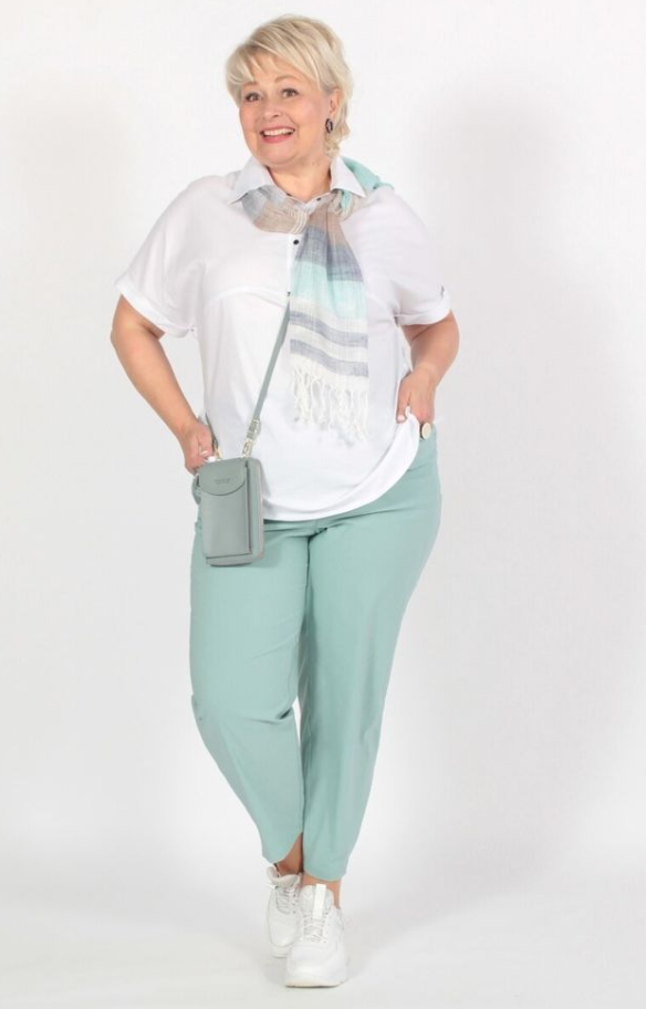 - Летние комплекты: Для полной невысокой женщины зрелого возраста подходит комплект из мятно-бирюзовых брюк и светлой футболки свободного кроя. Завершите образ легким шарфиком, повязанным на шее, и выберите удобную обувь, например, кроссовки для повседневного комфорта.