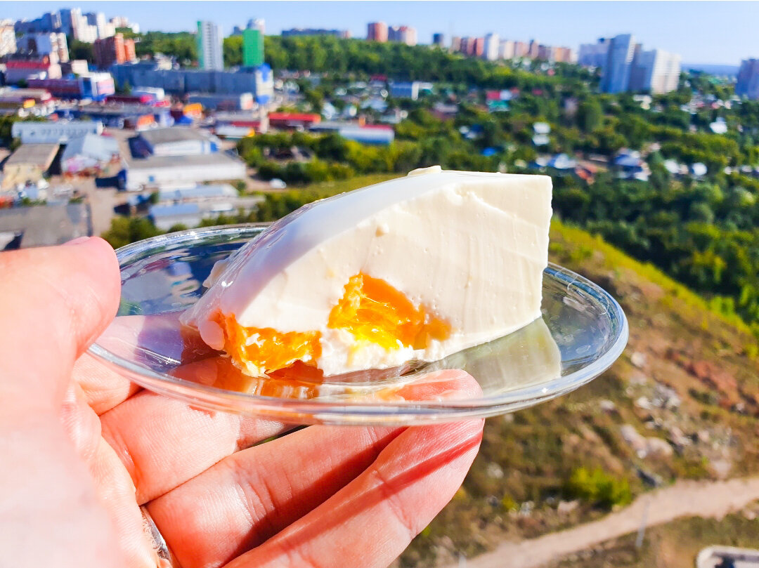 Теперь подготовьте форму. На дно круглой чаши выложите нарезанные фрукты, затем залейте сметанную массу сверху. Если хотите, можно добавить еще фруктов для большего разнообразия. Уберите в холодильник до полного застывания.