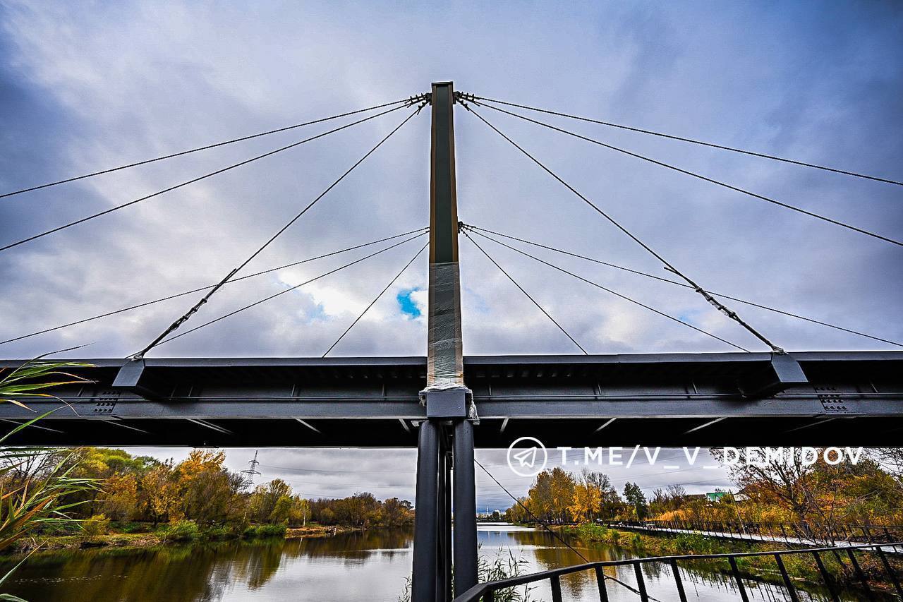 Строители возвели металлические конструкции и стальные тросы, которые поддерживают пролеты, скоро приступят к оборудованию резинокордового настила и подхода к мосту, который огибает конструкцию (его оформят террасной доской).