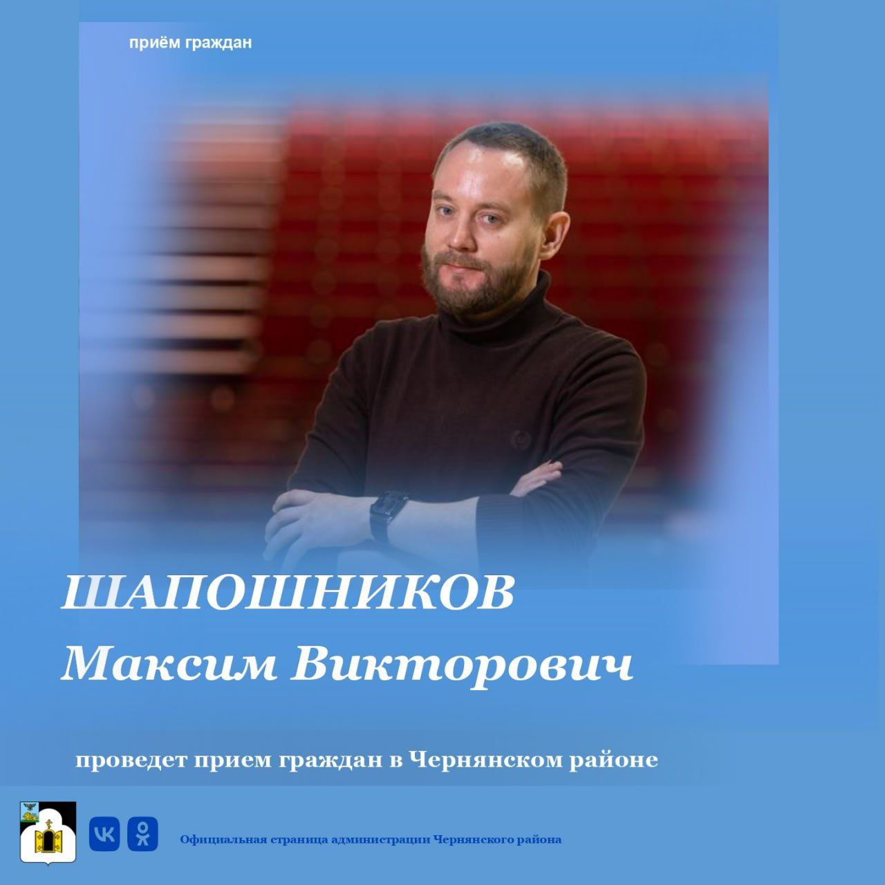 29 октября в 11:00 в администрации Чернянского района по адресу: п. Чернянка, площадь Октябрьская, д. 1, состоится приём граждан, который проведёт министр культуры Белгородской области Максим Викторович Шапошников.