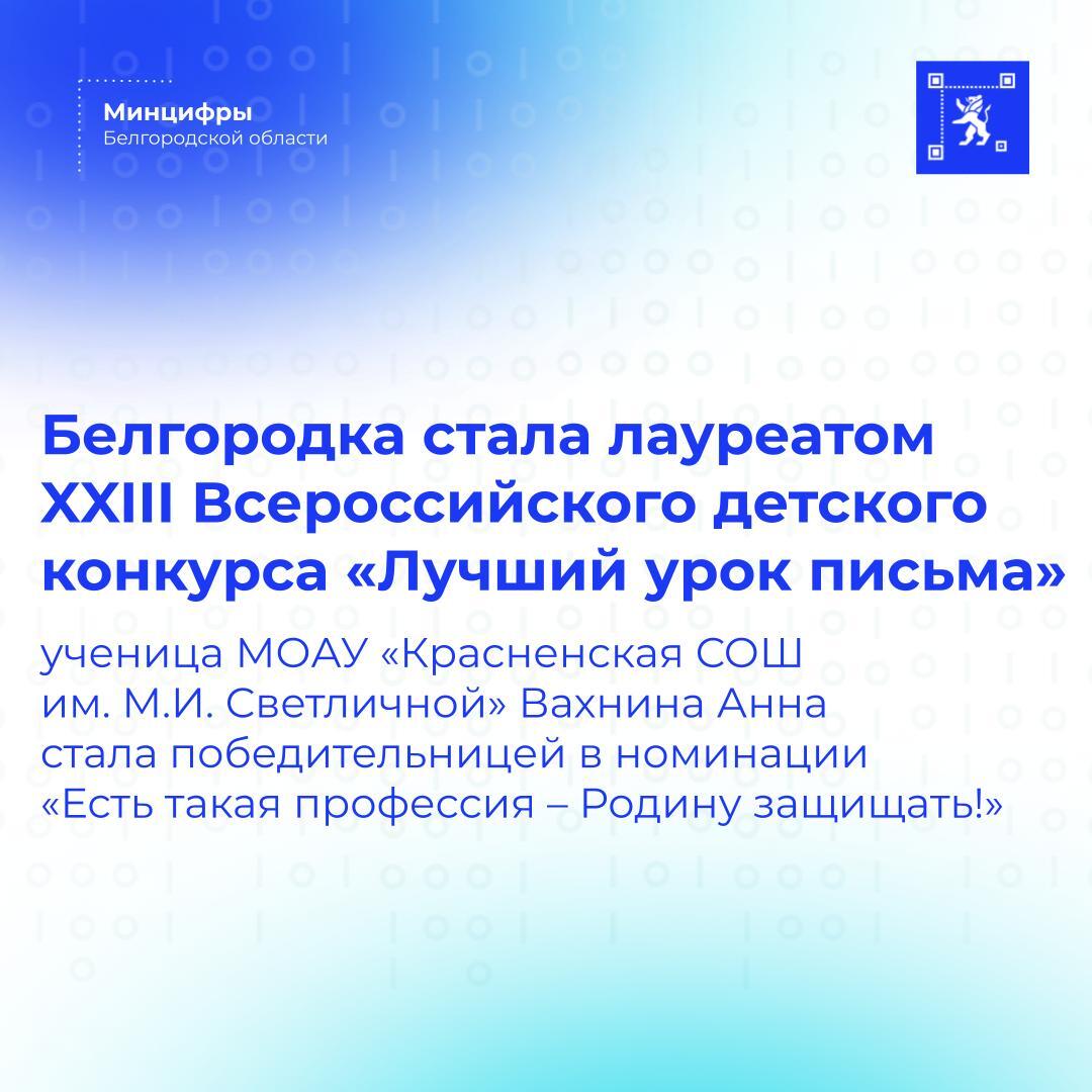 Звание Лауреата в номинации «Есть такая профессия – Родину защищать!» получила Вахнина Анна, ученица МОАУ «Красненская СОШ им. М.И. Светличной», с. Красное, Красненского р-на. Всего со всей страны в почтовом конкурсе «Лучший урок письма – 2025» жюри выбрало лучшими 46 школьников и 6 учителей.