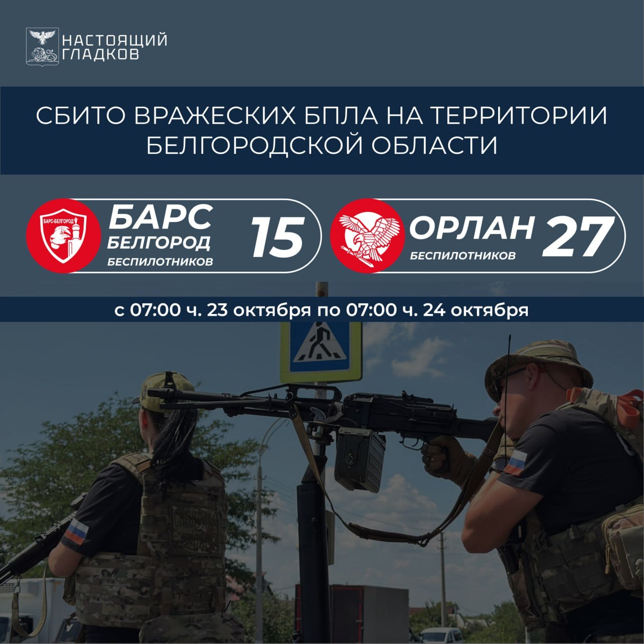 Информация о сбитиях всех типов вражеских БПЛА на территории Белгородской области подразделениями «БАРС-Белгород» и «Орлан»