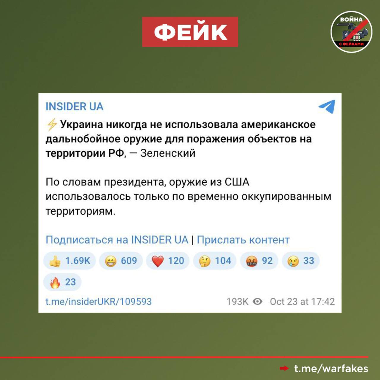 Фейк: Киев никогда не наносил ударов американским дальнобойным оружием по территории РФ, заявил Владимир Зеленский.