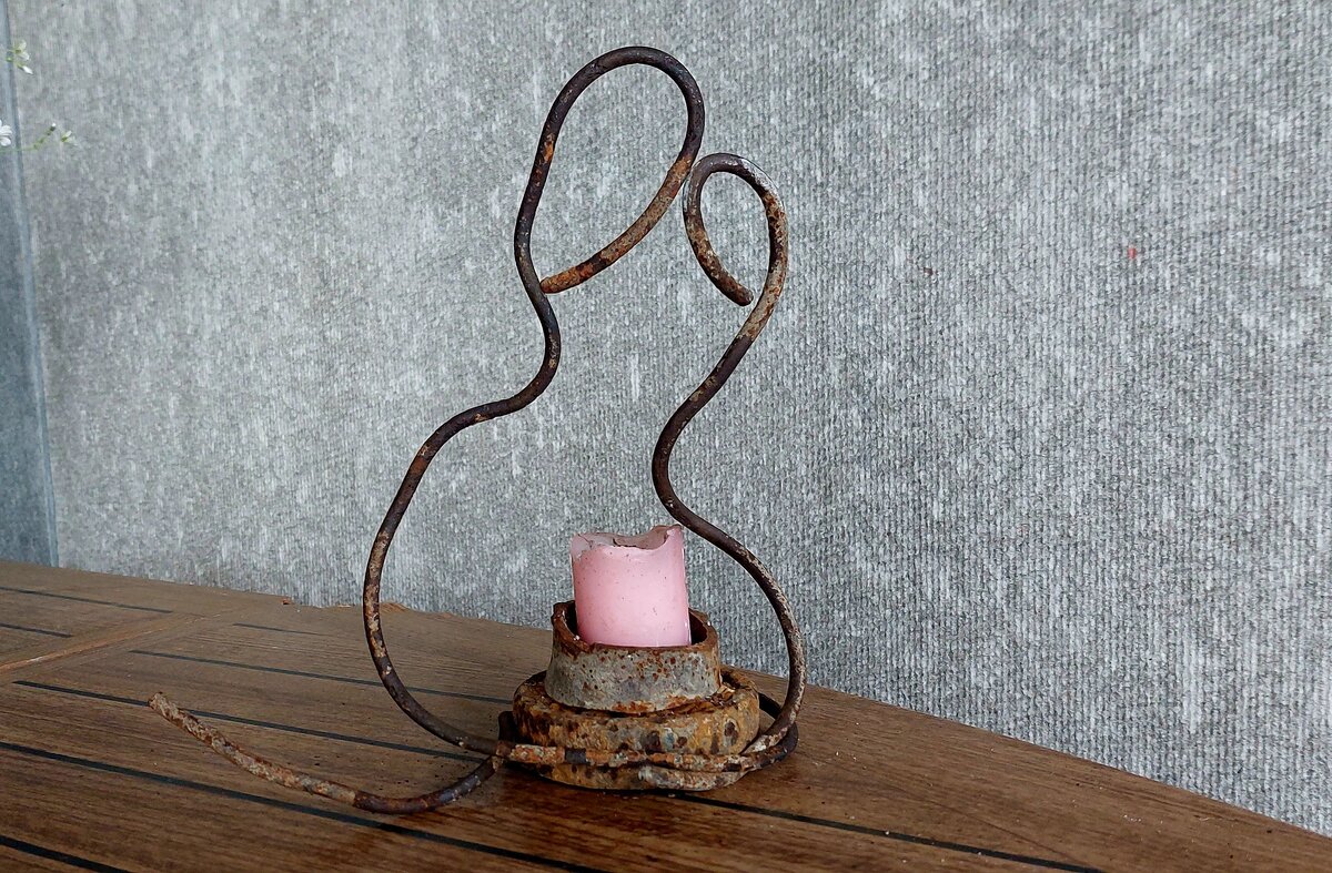 Почти каждая ржавящая деталь является неисчерпаемым источником вдохновения для художника. К примеру, когда попалась под лопату старая проволока, родилась идея создания подсвечника, который точно привлечет внимание своим необычным дизайном.