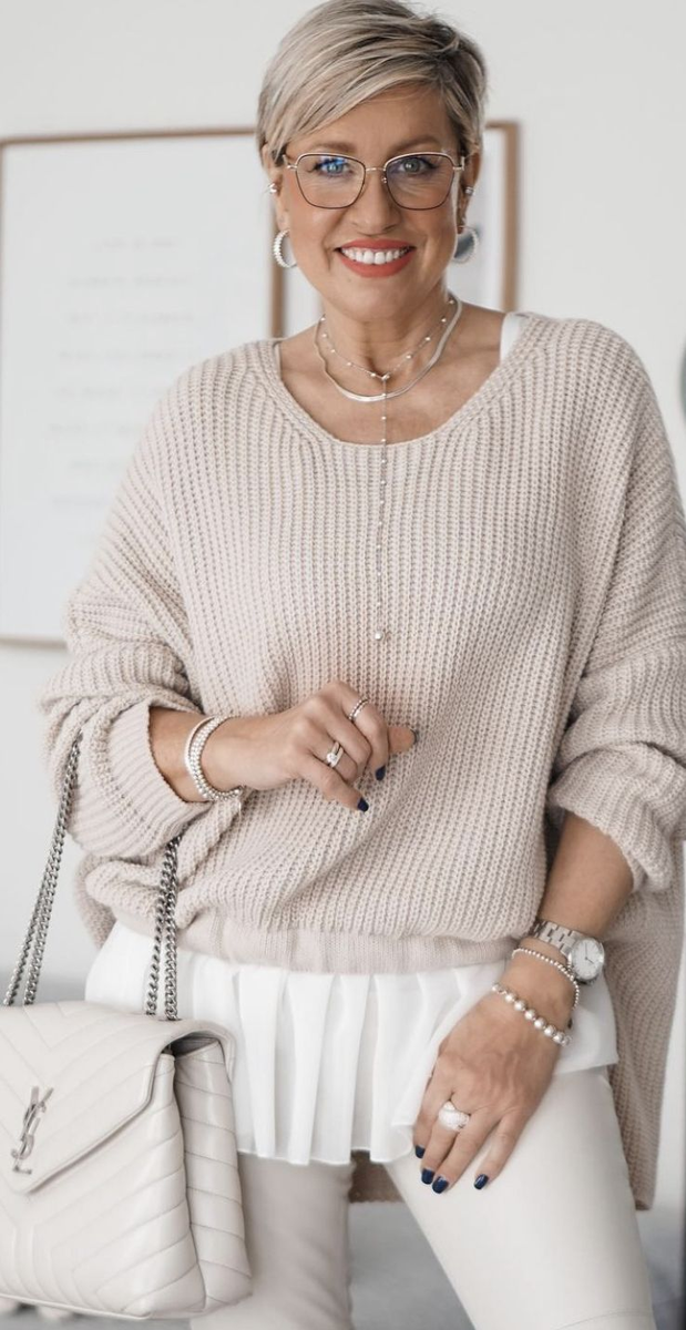 - Свитера: выбирайте модели нейтральных тонов, таких как серый, кремовый или темно-синий. Свежие акценты в виде ярких расцветок тоже приветствуются. Вязка с косами или ребристая текстура придаст образу оригинальности.