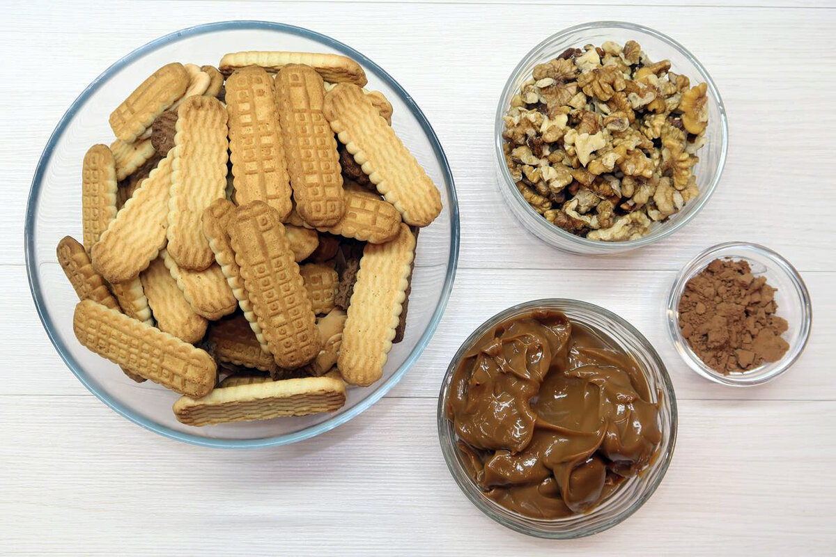 Теперь смешайте в глубокой миске крошку печенья, измельченные орехи и вареную сгущенку. Хорошо перемешайте, чтобы сладость равномерно распределилась по всей смеси.