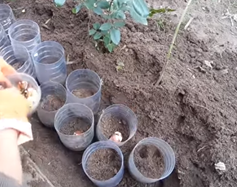 Один из популярных способов — использование пластиковых бутылок. Этот метод включает в себя изготовление стаканов из бутылок, в которых прорезают отверстия в боках и дне для стока лишней воды. На дно стакана выкладывается слой грунта, затем размещается луковица тюльпана, и всё это засыпается землёй.