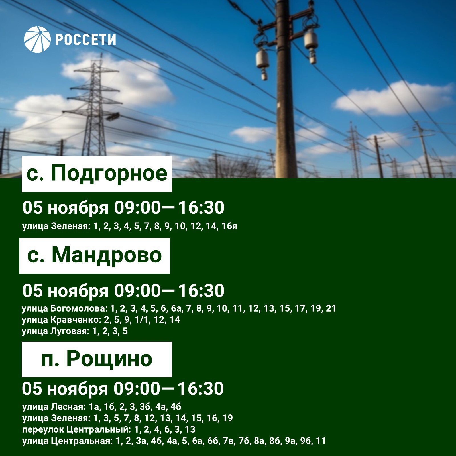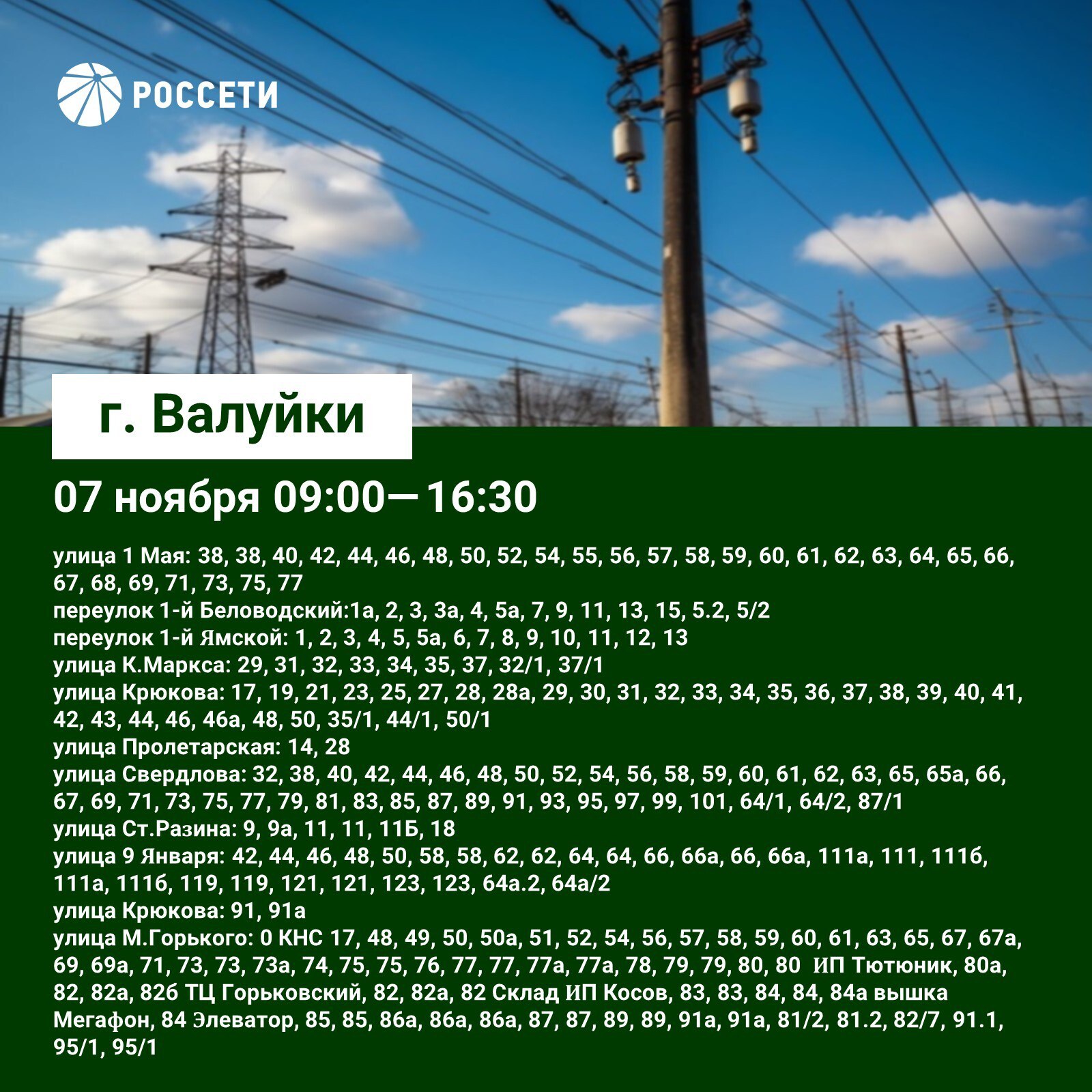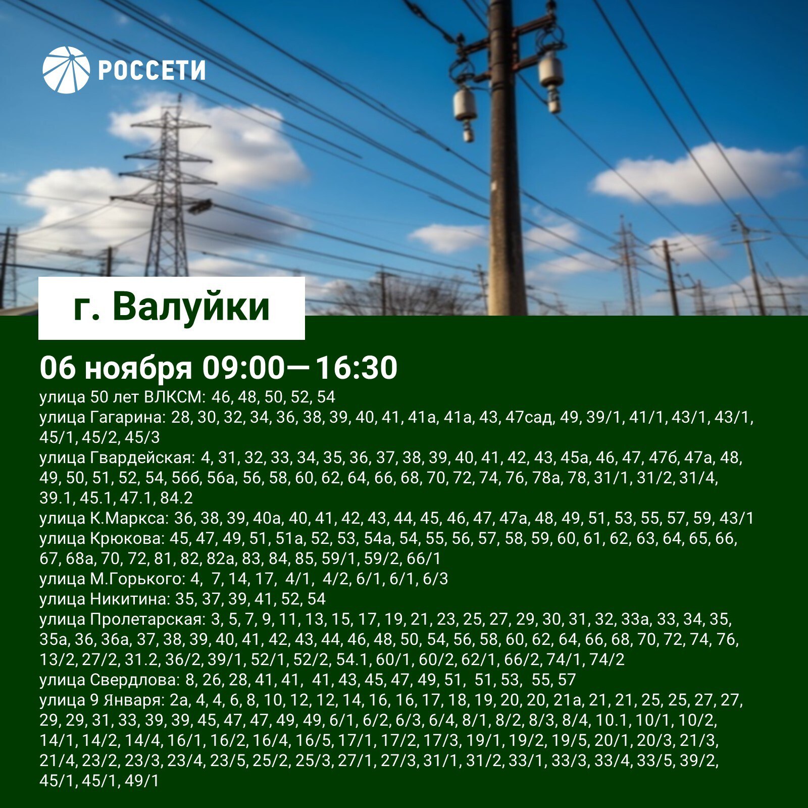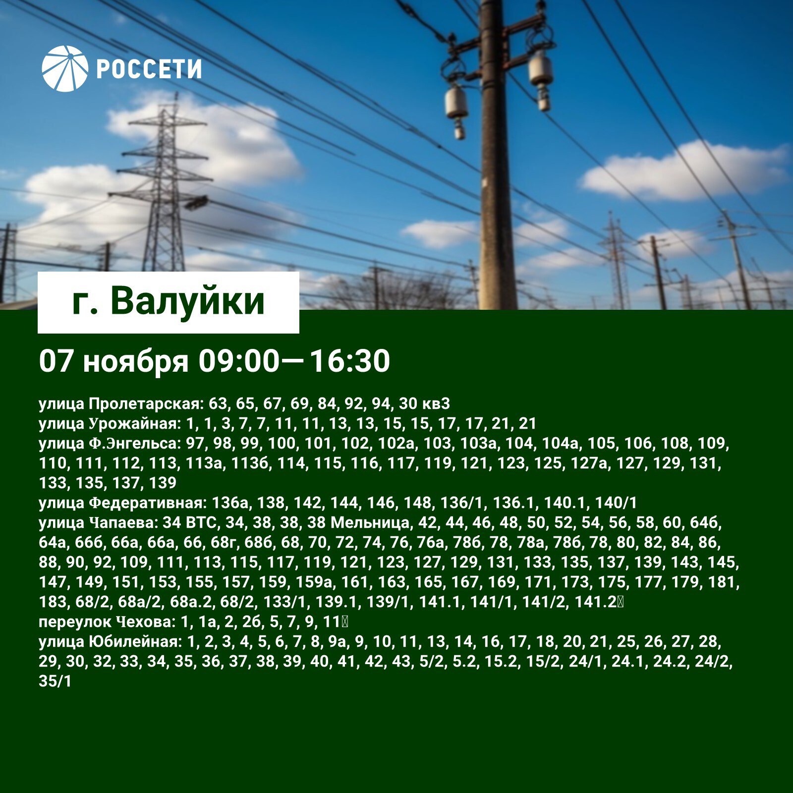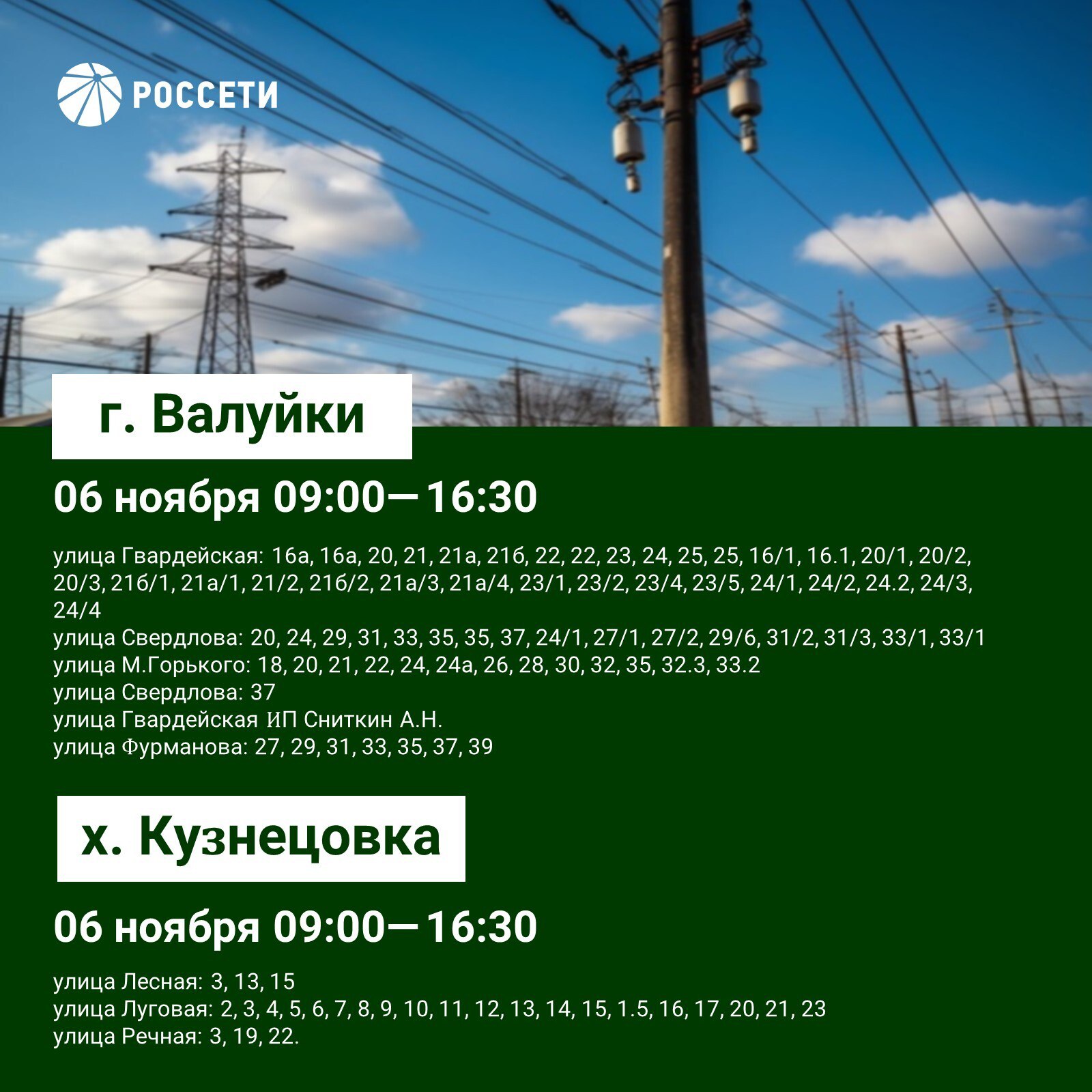 План-график отключений ЛЭП и оборудования Валуйского РЭС с 03 по 09 ноября