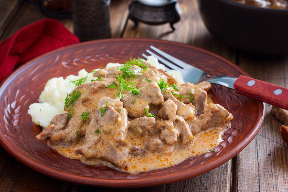 - Говядина по-строгановски — классика жанра, приготовленная в томатно-сметанном соусе с добавлением лука. Бульон добавляет насыщенности вкусу, а разносолы порции получаются нежными и ароматными.