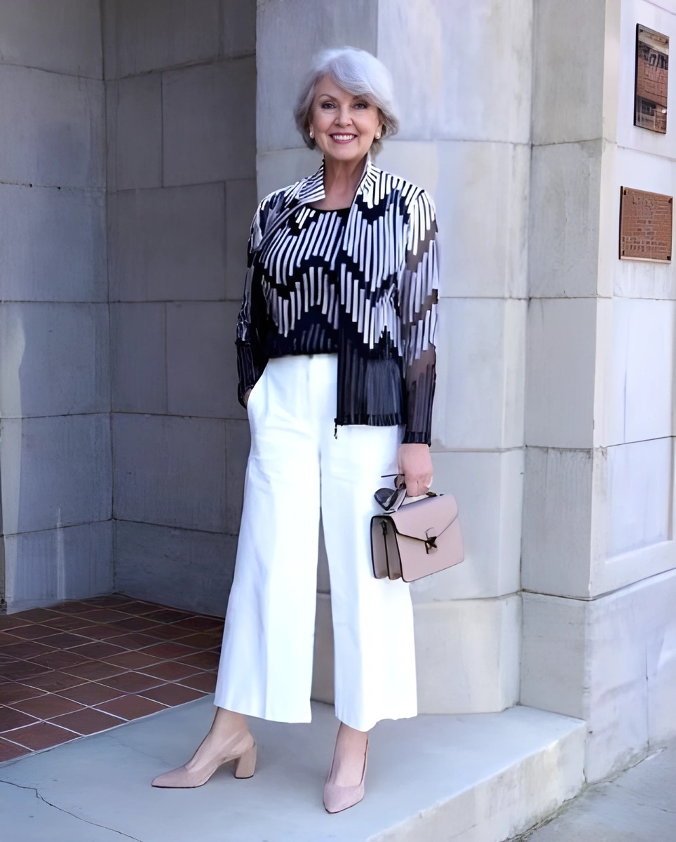 6. Черные брюки-«сигареты» в сочетании со светло-серым жакетом с необычным принтом — отличный выбор для стильной зрелой женщины. Этот образ подчеркивает привлекательные стороны и демонстрирует уверенность в себе, а классические туфли на каблуке завершают наряд.