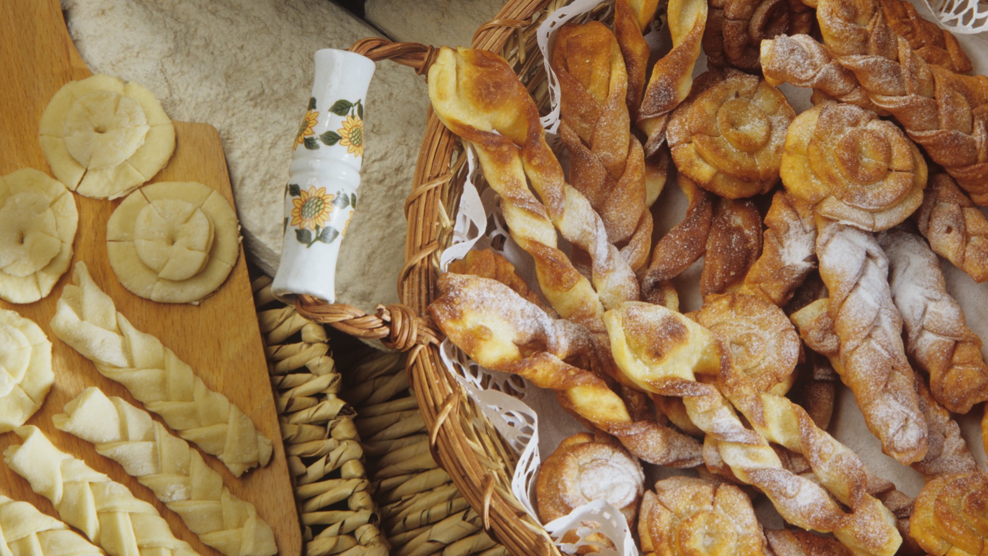 Тесто замесите вручную. Дайте ему отдохнуть полчаса. Тесто нужно раскатать, затем вырезать из него прямоугольники. В каждом сделайте надрез посередине. Осторожно выверните края хвороста через полученное отверстие.
