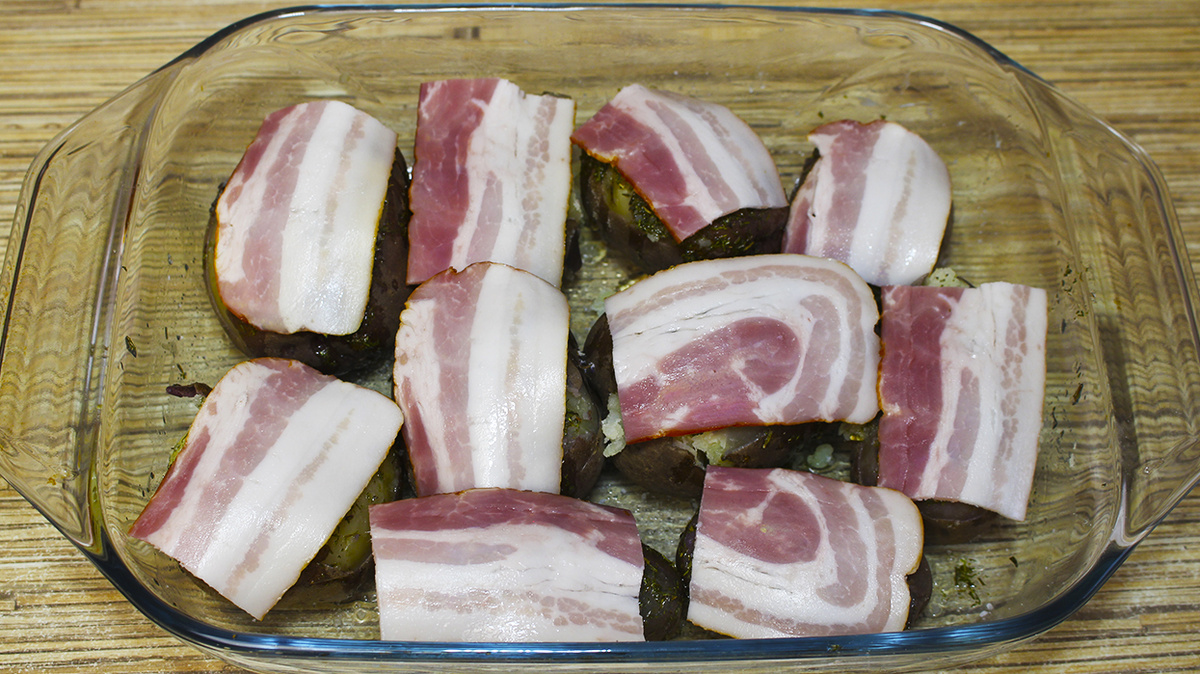 Ароматная заправка из растительного масла с добавлением сушеного укропа и тимьяна не только обогатит вкус, но и создаст удивительное сочетание с беконом, который в дальнейшем аккуратно выкладывается поверх картофеля, пропитывая его соками. Завершающим аккордом становится тертый сыр, который коронует блюдо.