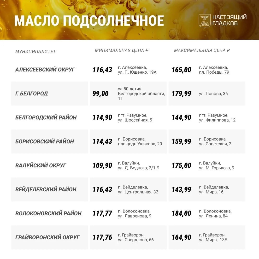Вячеслав Гладков назвал самые низкие и высокие цены на подсолнечное масло в области
