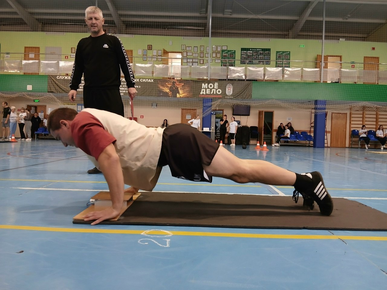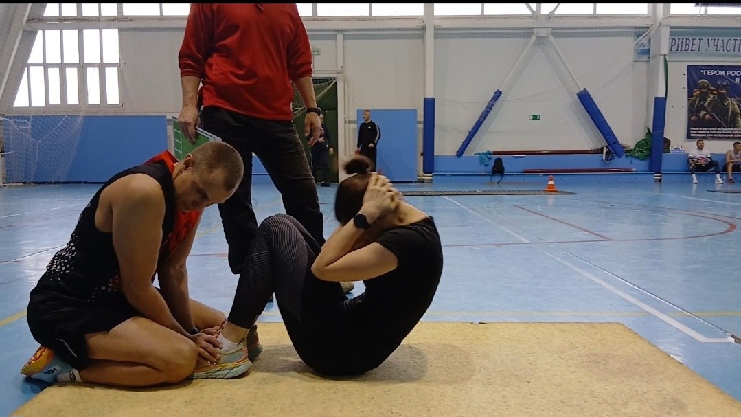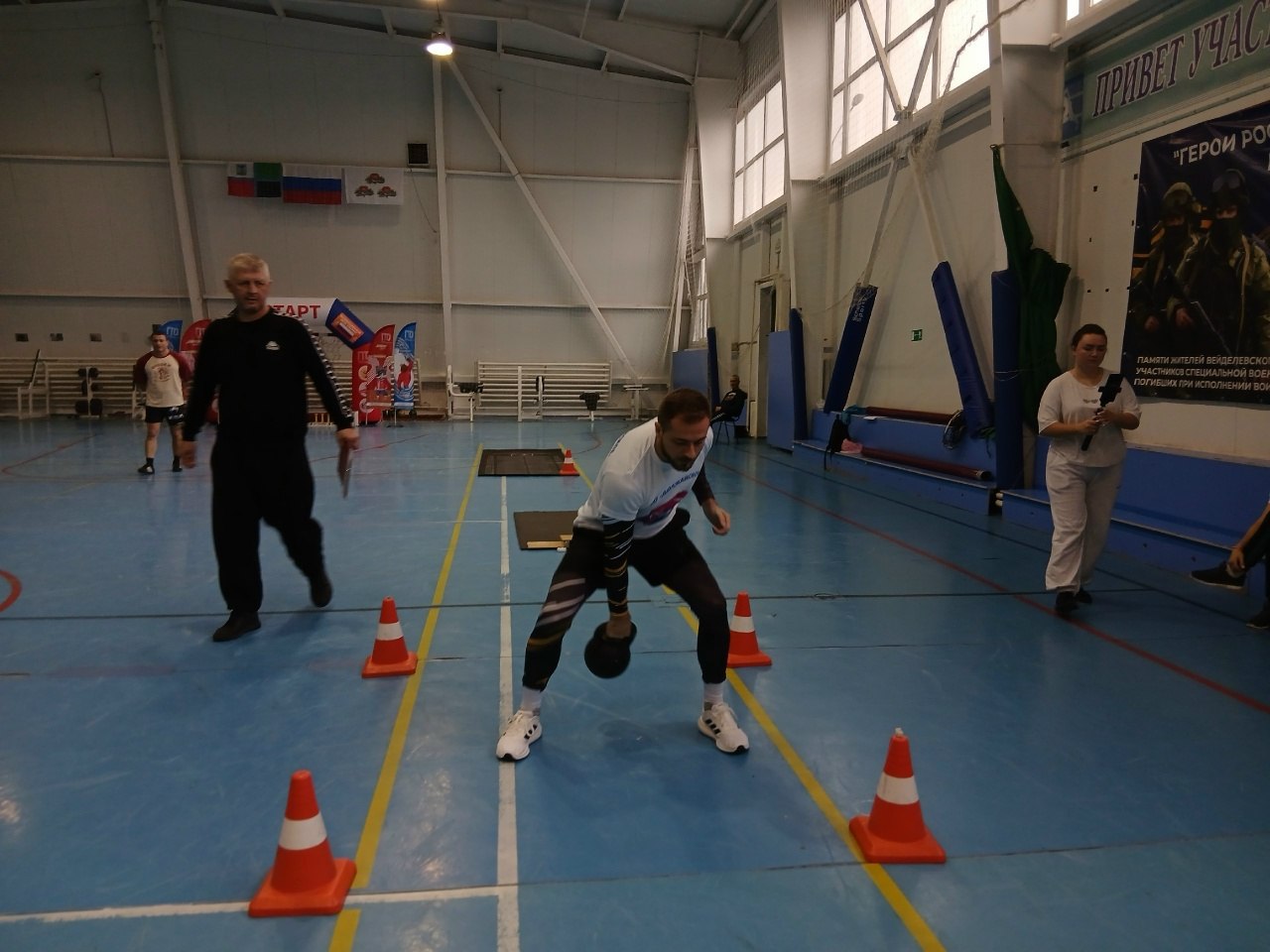 Рывок гири весом 12 кг (мужчины), Приседание с гирей 8 кг (женщины) ;