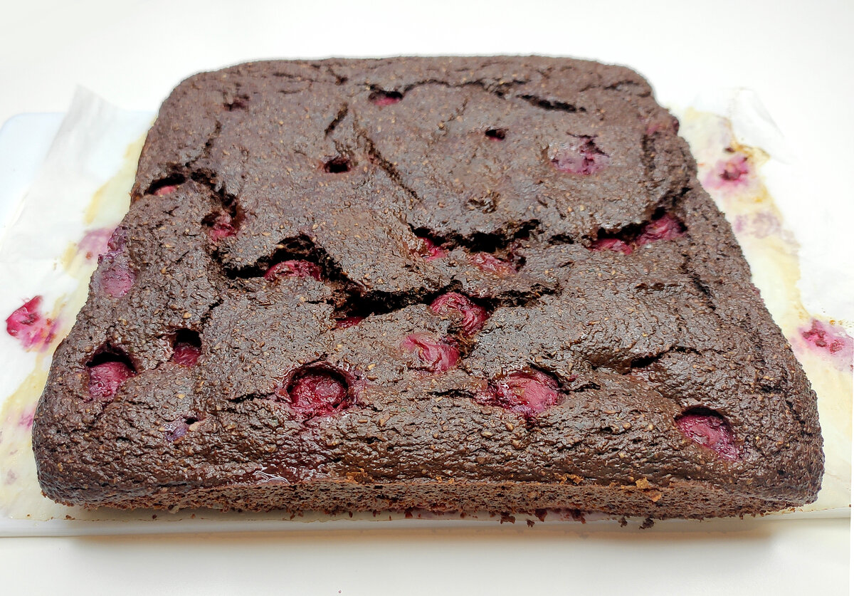 Приготовьте вишневую начинку: замороженную вишню соедините с крахмалом и подсластителем, не размораживая. Эту ароматную массу аккуратно добавьте в тесто и перемешайте лопаткой. Затем подготовьте форму (18 см) — выложите ее пергаментом и аккуратно вылейте тесто. В нагретой до 180 градусов духовке запекайте пирог около 45 минут.