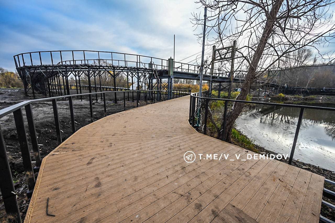 Здесь установили металлические конструкции, тросы и резиновое покрытие для пешеходов и велосипедистов. Смонтировали освещение – его запустят в начале недели. Также строители сделали подходы к мосту и парковку, сейчас обустраивают спуски к воде для рыбаков.