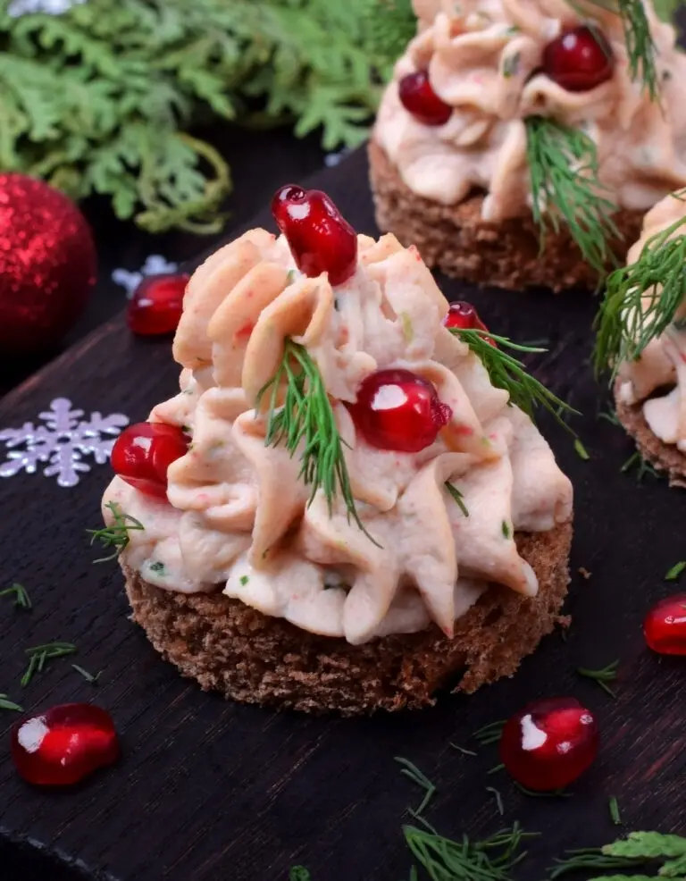 Используя насадку, приготовленный мусс аккуратно выкладывается на кусочки хлеба. Завершают презентацию закуски различными украшениями по вкусу.