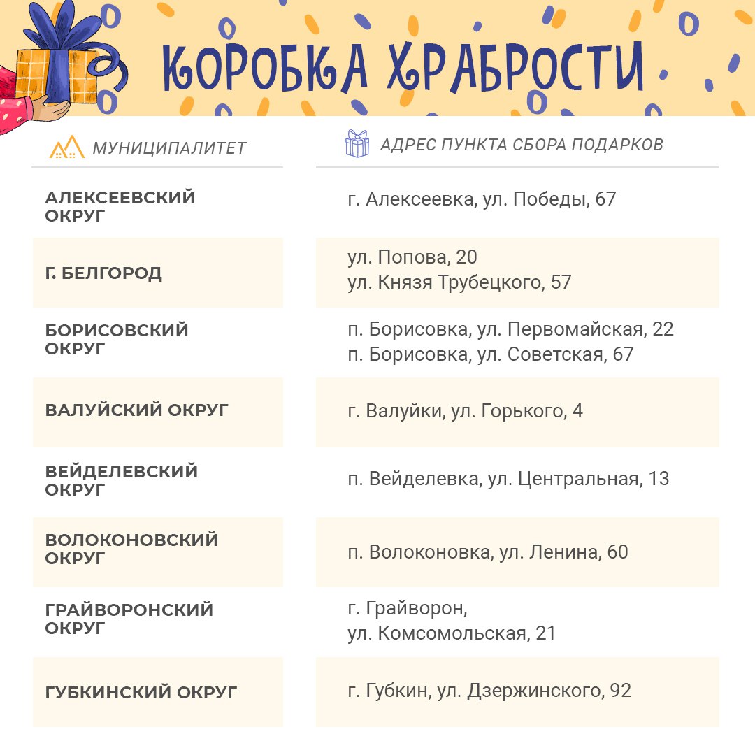 Сейчас в области проходит «Коробка Храбрости» — акция, где все желающие могут поддержать детей, находящихся на длительном лечении и реабилитации в медучреждениях. До 2 декабря приносите игрушки, наборы для творчества, пазлы — любые подарки, которые согреют детские сердца. Вы можете оставить их в специальных пунктах сбора — адреса в карточках.