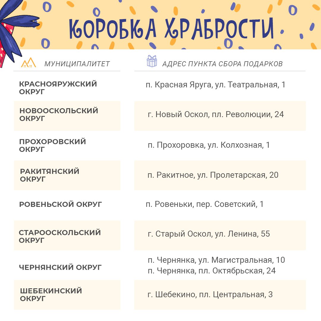 Прямо сейчас в нашей области проходит добрая инициатива под названием «Коробка Храбрости». Её участники стремятся сделать жизнь ребятишек, проходящих длительное лечение и восстановление в больницах, немного светлее и радостнее. До 2 декабря каждый желающий может внести свою лепту, подарив игрушку, творческий набор, пазл или любой другой подарок, способный порадовать ребёнка. Для удобства организованы специальные места приёма, ознакомиться с которыми можно в прикрепленных картах.
