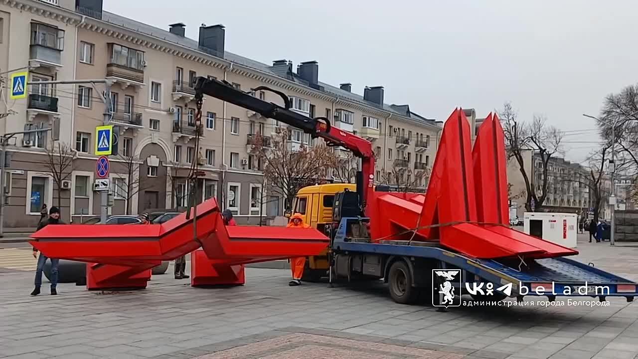 10 таких уличных конструкций установили к празднику Победы – 9 Мая в разных местах города. В год 80-летия Победы с мая по ноябрь они создавали праздничную атмосферу. Теперь их демонтируют и транспортируют на хранение на базу «Белгорблагоустройство».