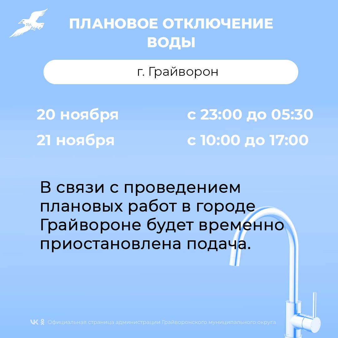 Внимание!В связи с порывом водопровода на водозаборе водопроводной насосной станции «Ромашовка» 21 ноября с 9:00 до устранения будет проведено отключение холодного водоснабжения в микрорайоне «Соцгород».