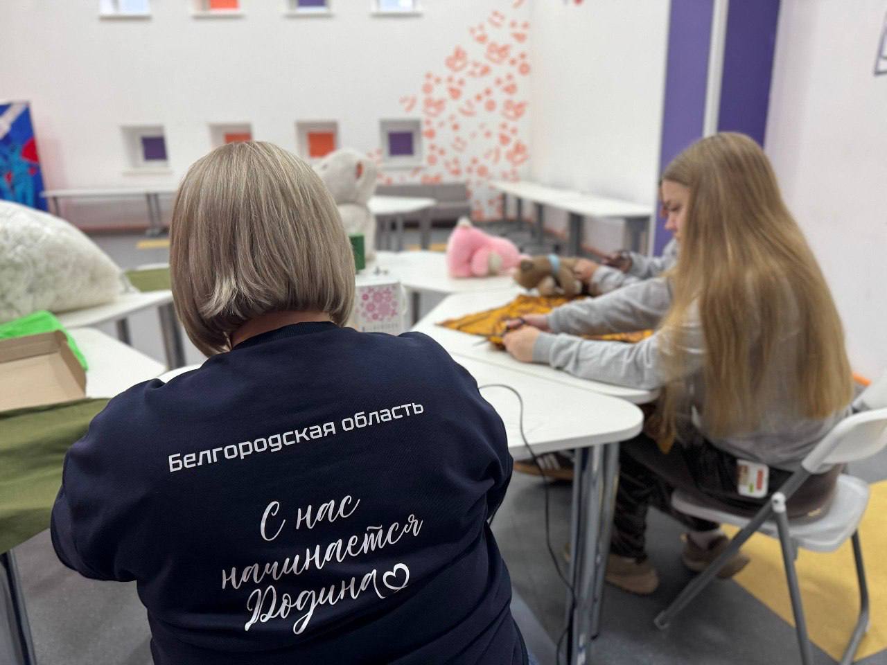 Силами волонтёров из подготовленных материалов изготавливаются подушки для военнослужащих, участвующих в специальной военной операции.