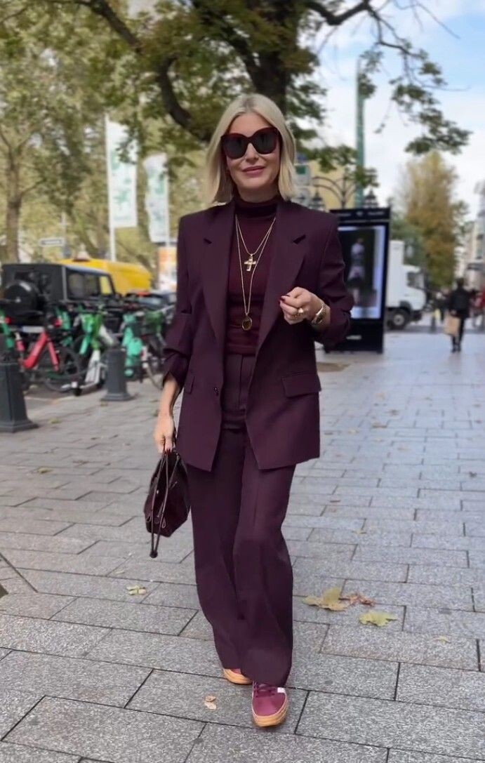 - Стильный костюм в бордовых тонах – этот комплект включает облегающие брюки с высокой посадкой, стильно приталенный жакет и нейтральную водолазку. Такой наряд идеально подойдет как для офисного стиля, так и для культурных мероприятий. Обувь в тон, например, светло-бордовые кеды на толстой подошве, добавит комфорта.