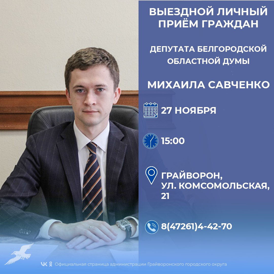 Приём состоится 27 ноября в 15:00 в администрации Грайворонского округа по адресу: г. Грайворон, ул. Комсомольская, 21.