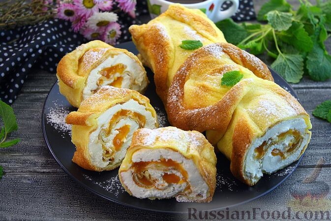 - Ленивый эклер с творожным кремом — этот уникальный десерт готовится не из традиционного заварного теста, а из легкого блинного, придающего ему необычайную нежность. Коржи, выпеченные до золотистой корочки, сворачиваются в рулет и заполняются кремом из творога и сгущенного молока, с добавлением ароматного абрикосового джема.