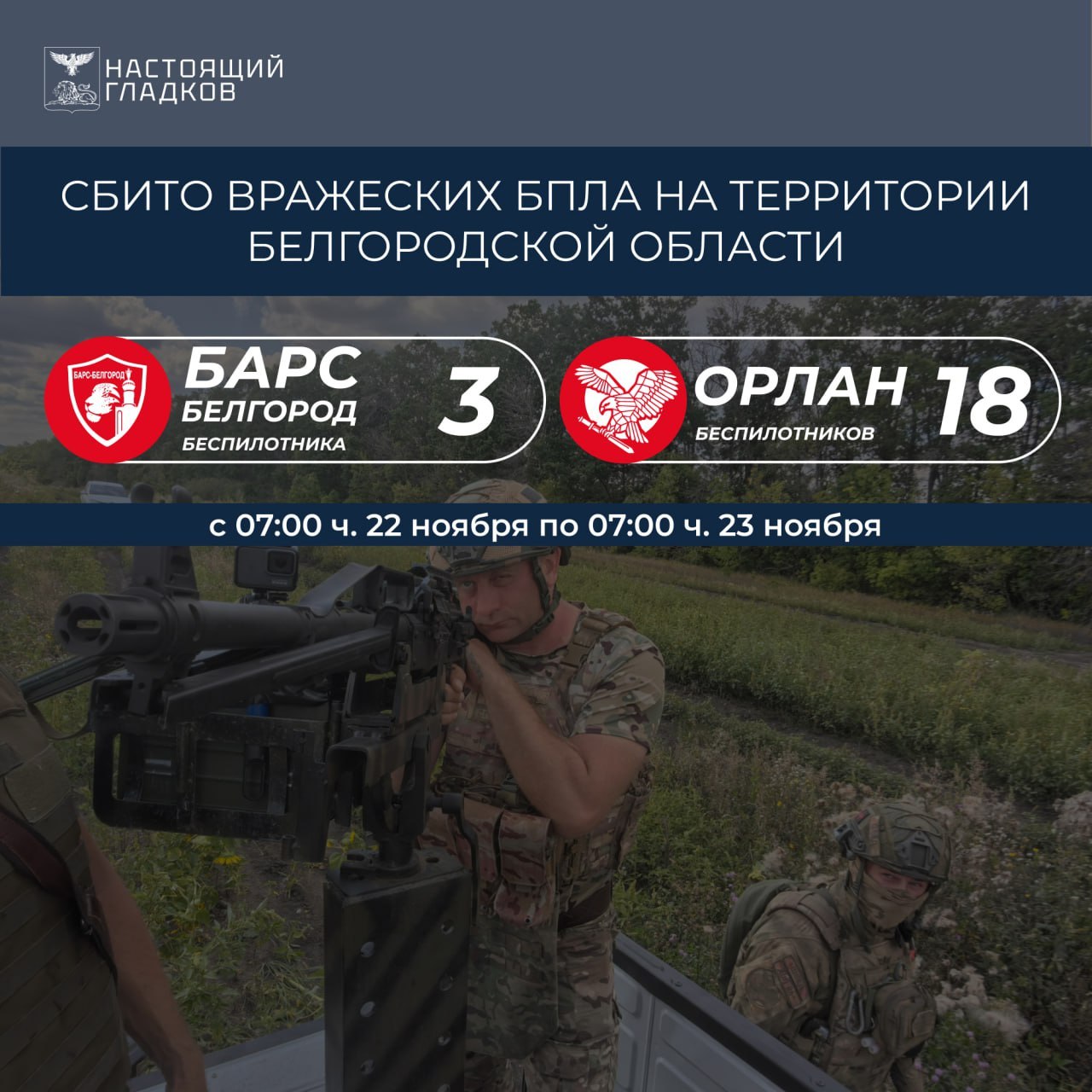 С 07:00 ч. 22 ноября по 07:00 ч. 23 ноября ликвидирован 21 беспилотник