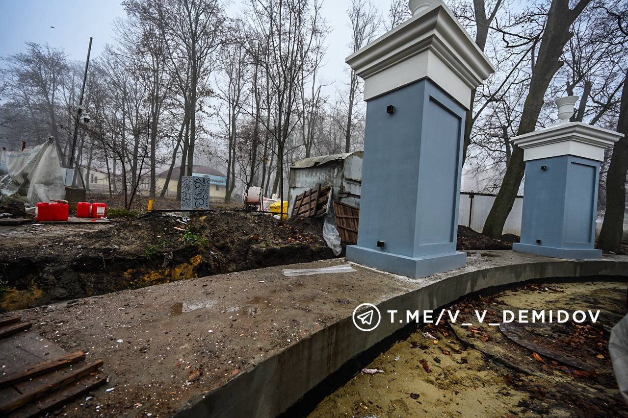 Как отметил Валентин Демидов, одновременно продвигается восстановление радиусного ограждения: установлены 10 колонн, которые уже оштукатурили, окрасили и оснастили архитектурными деталями.