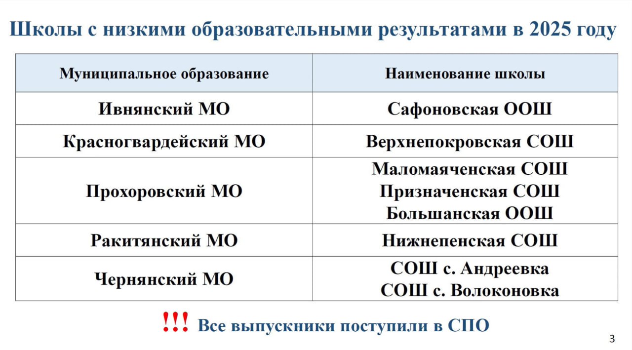 Для улучшения ситуации глава региона предложил закрепить за отстающими учреждениями наставников из школ-лидеров, откорректировать учебные программы и выявить пробелы в профессиональных знаниях и навыках педагогов. Работа по улучшению качества образования коснётся Ивнянского, Красногвардейского, Ракитянского, Прохоровского и Чернянского округов.
