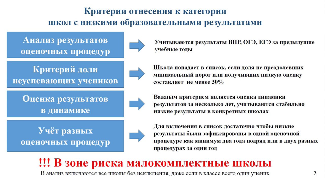 Школа попадает в список, если более 30% учеников не сдают экзамены с первой попытки. При этом малокомплектные школы оказываются в зоне риска, даже если один выпускник не прошёл аттестацию.