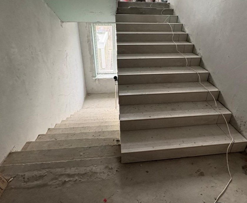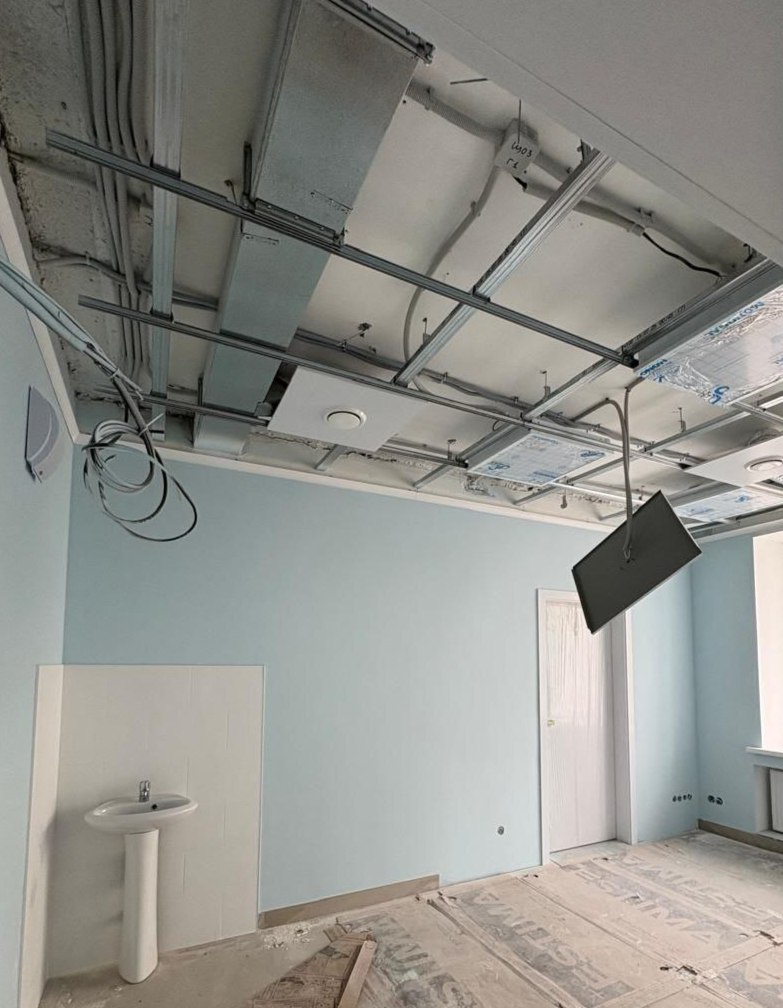 В настоящий момент рабочие завершают устройство дверных блоков, потолков армстронг и окрашивание стен, выполняют монтаж ограждения лестничных маршей.