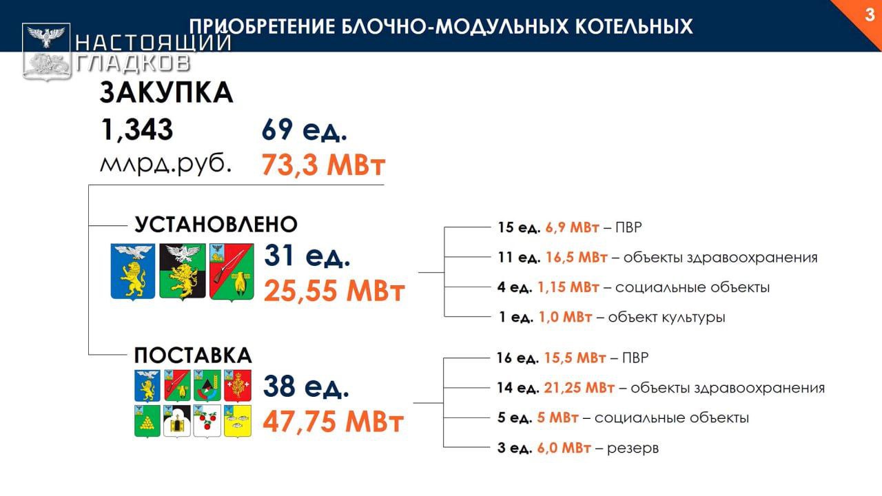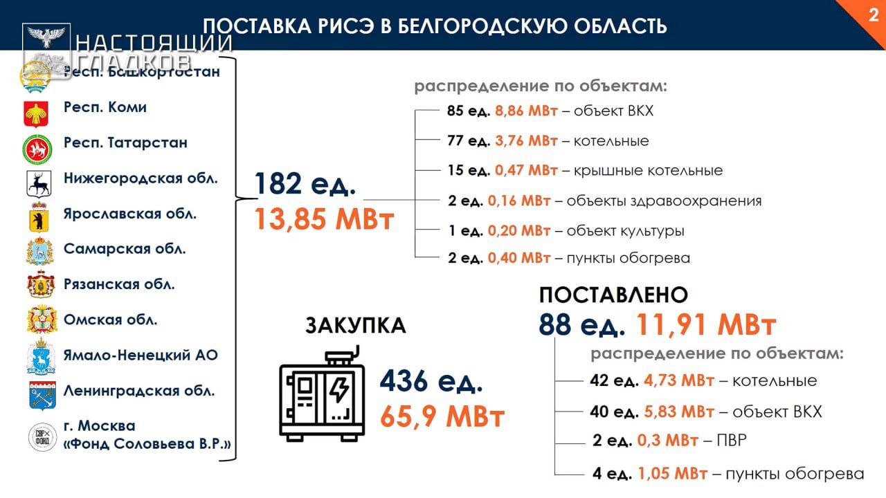 На средства из федерального бюджета запланирована поставка 436 единиц РИСЭ общей мощностью 65,9 МВт. Из них 88 генераторов общей мощностью 11,9 МВт уже прибыли, сейчас идёт их распределение в муниципальные образования и установка на социальные объекты.