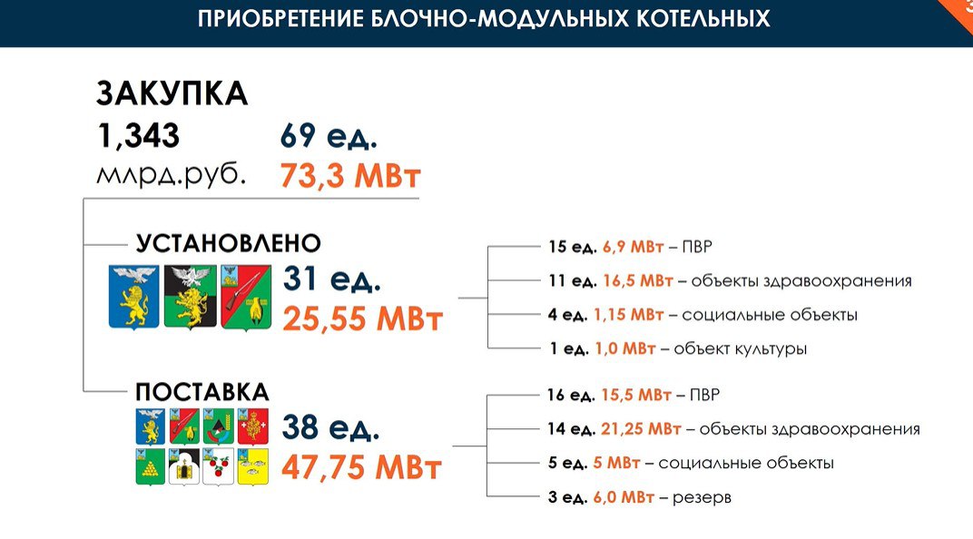 Дополнительно за счёт 1,3 млрд рублей из федерального резервного фонда закупили 69 блочно-модульных котельных, 31 из них уже установили.