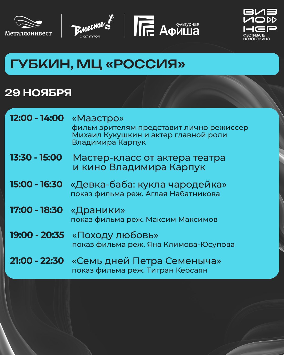 Фестиваль нового кино «Визионер» возвращается. С 27 по 30 ноября фильмы-лауреаты всероссийских и международных кинофестивалей будут доступны для просмотра зрителям Губкина, Старого Оскола и Железногорска