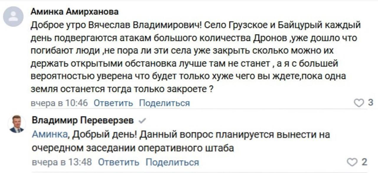 В комментариях под постом губернатора Вячеслава Гладкова местная жительница спросила, закроют ли сёла Грузское и Байцуры из-за частых атак ВСУ.