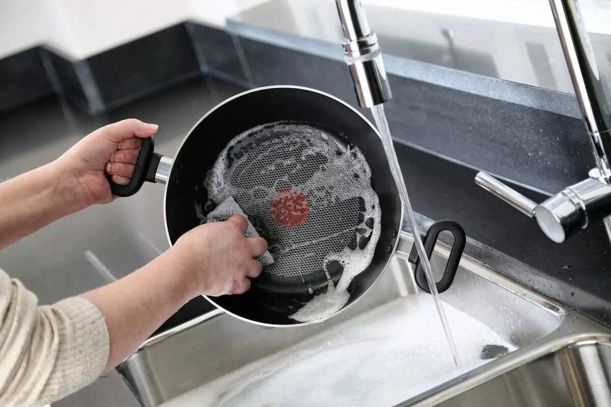- Если же есть необходимость мыть антипригарную посуду вручную, используйте теплую воду и мягкие губки. Избегайте трения жесткой стороной губки и долгое замачивание в воде, чтобы предотвратить повреждения защитного слоя.